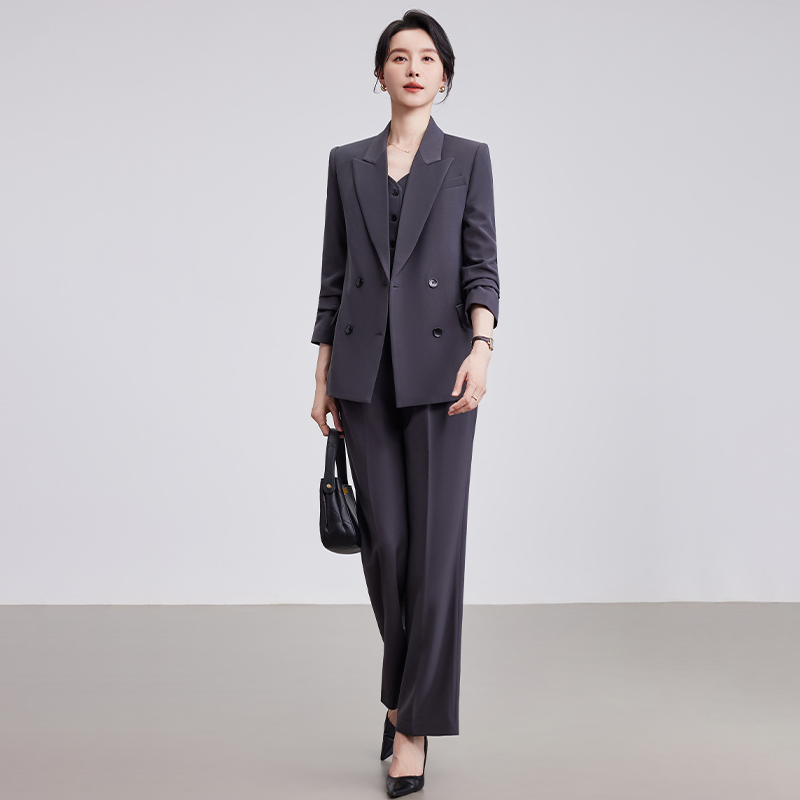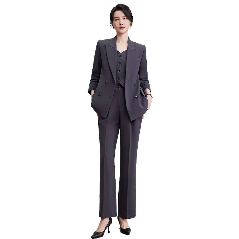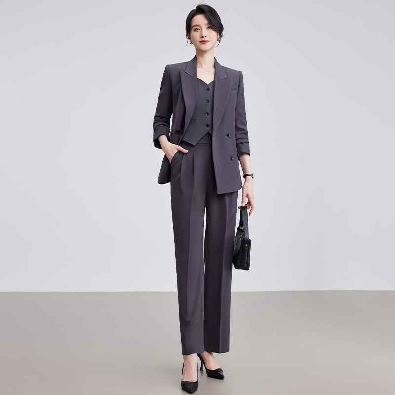 诗璐雅职业西装马甲套装女士灰色高级感气质西服外套阔腿裤三件套