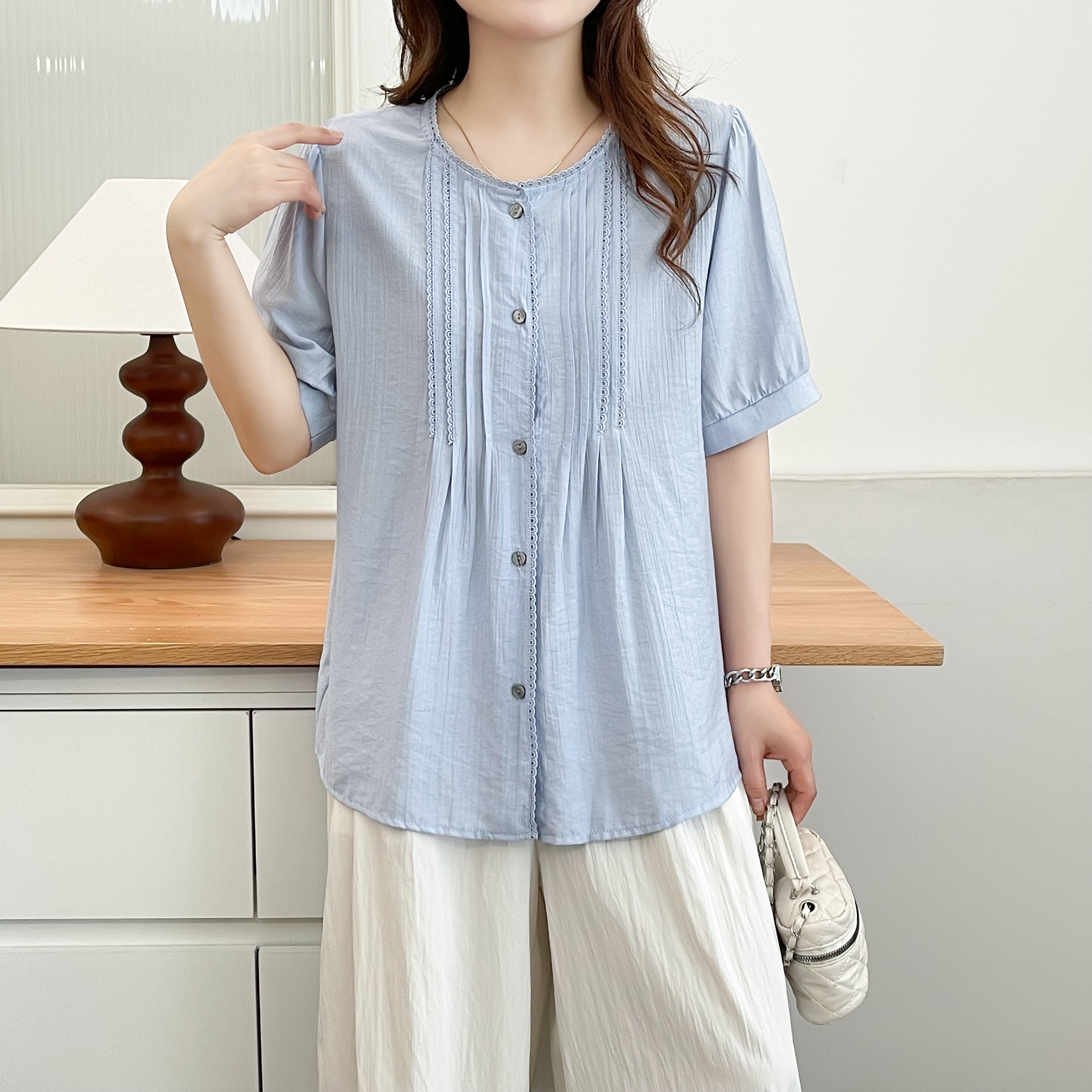 2025夏装新款大码女装休闲上衣设计感圆领蕾丝拼接压褶短袖衬衫