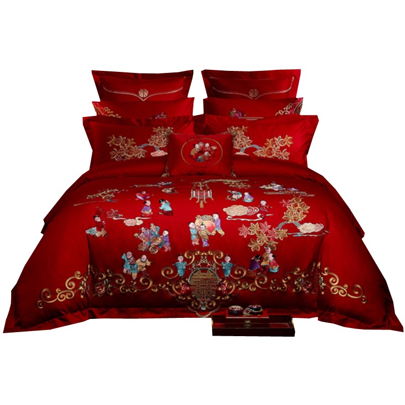 百子图四件套结婚喜庆大红贡缎刺绣六件套喜被纯棉百子被婚庆床品