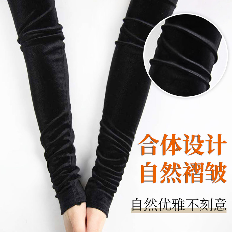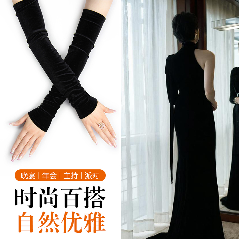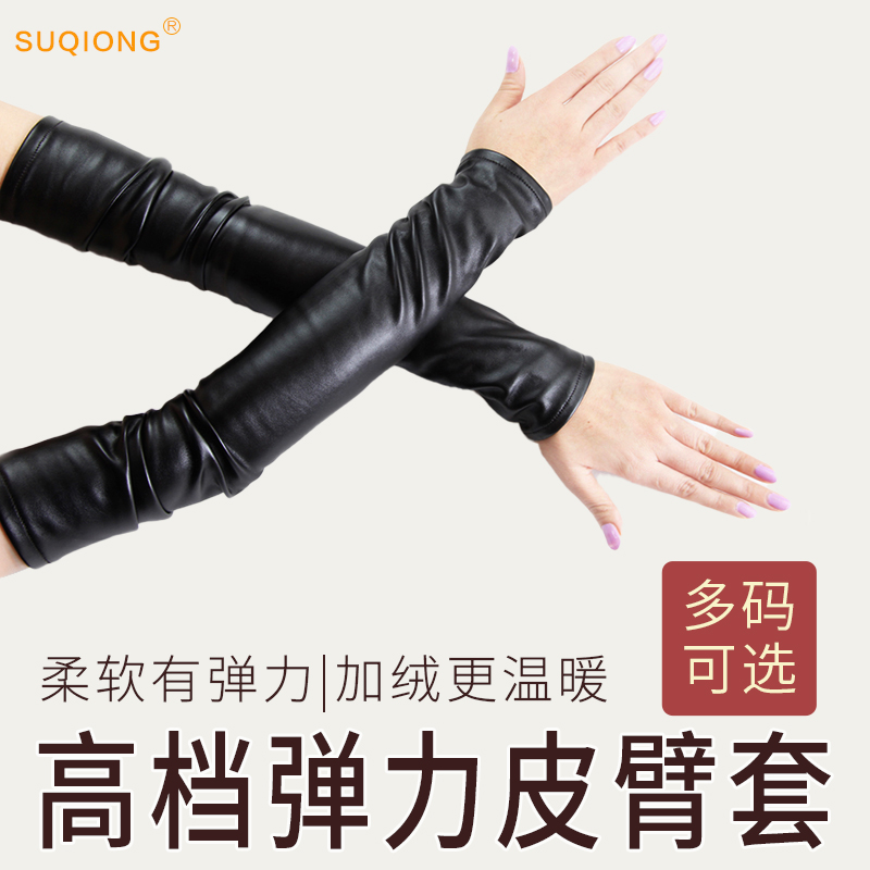 女士皮手套丝绒袖套露指手套长款臂套春季保暖袖筒黑色手套假袖子