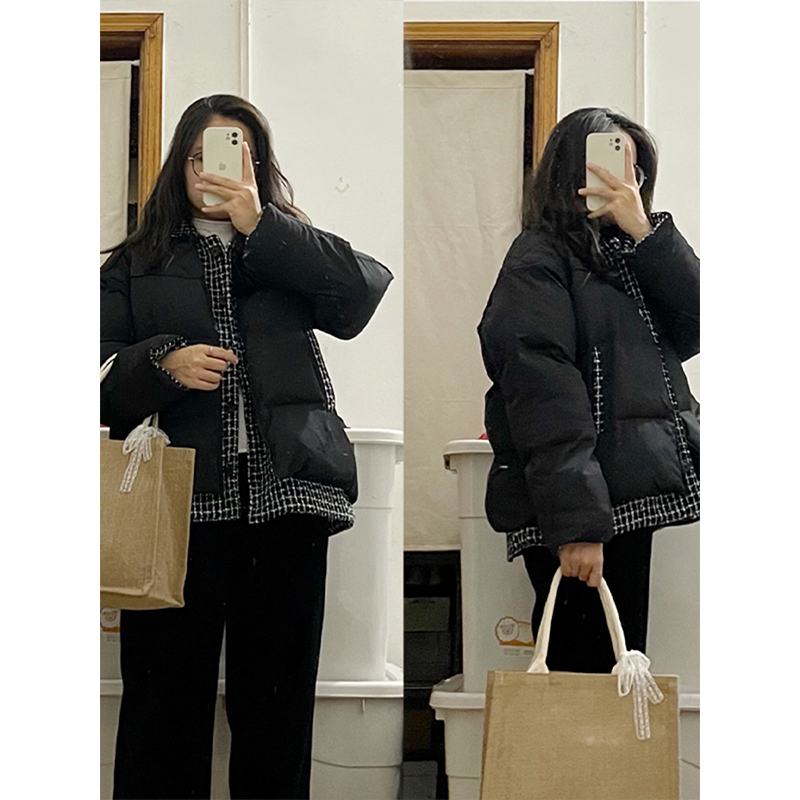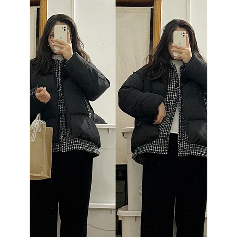 特大码女装胖mm假两件羽绒棉服秋冬高级感格子外套加厚保暖棉衣女