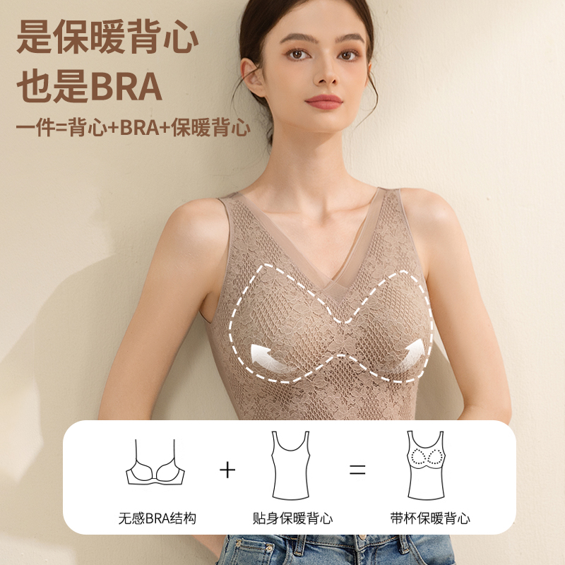 婷美蕾丝保暖背心女带胸垫2025新款冬季加绒加厚吊带防寒打底内衣