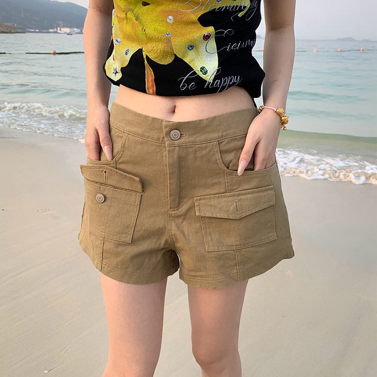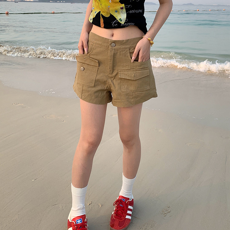 GTGA 夏季美式复古辣妹口袋工装牛仔短裤女新款高腰包臀显瘦热裤