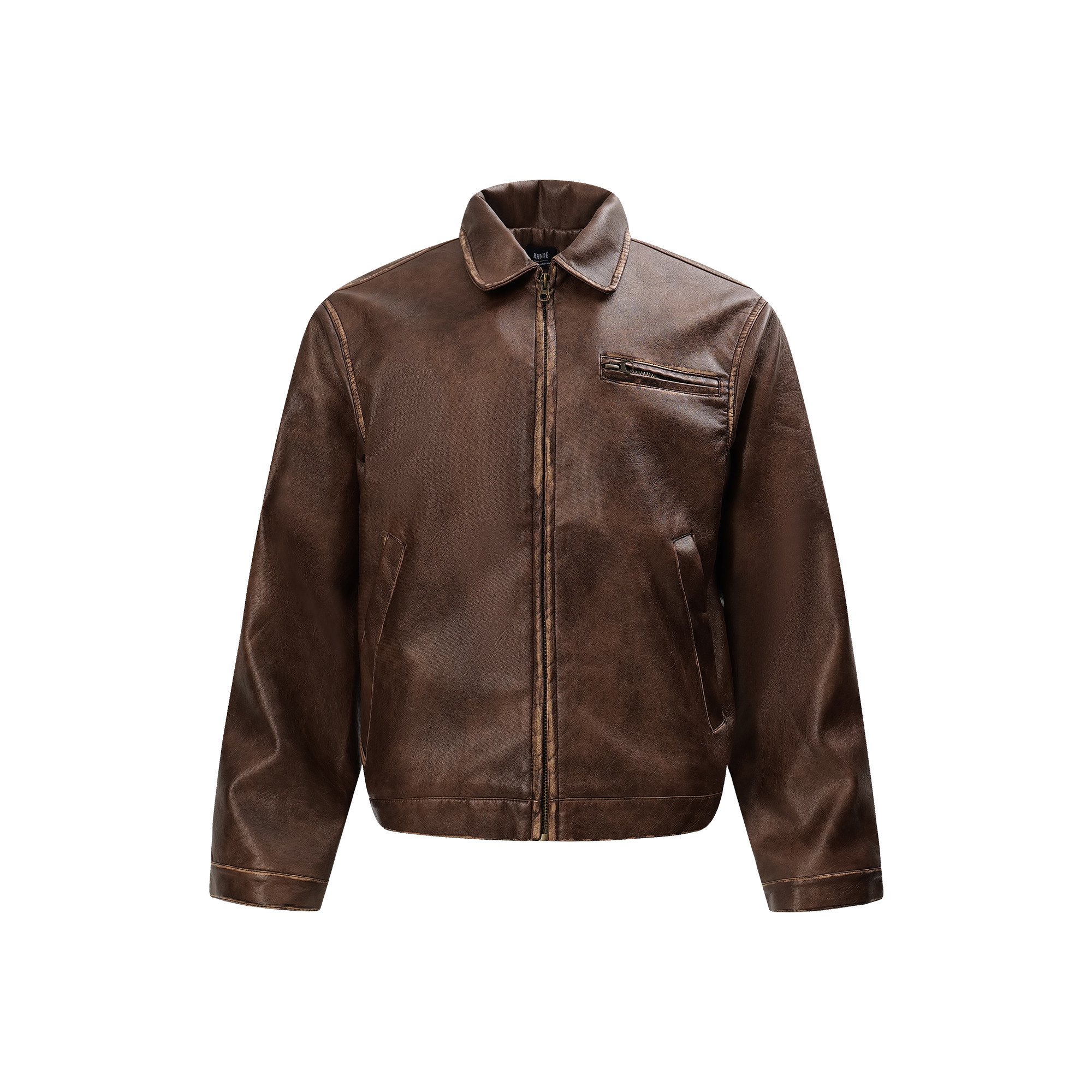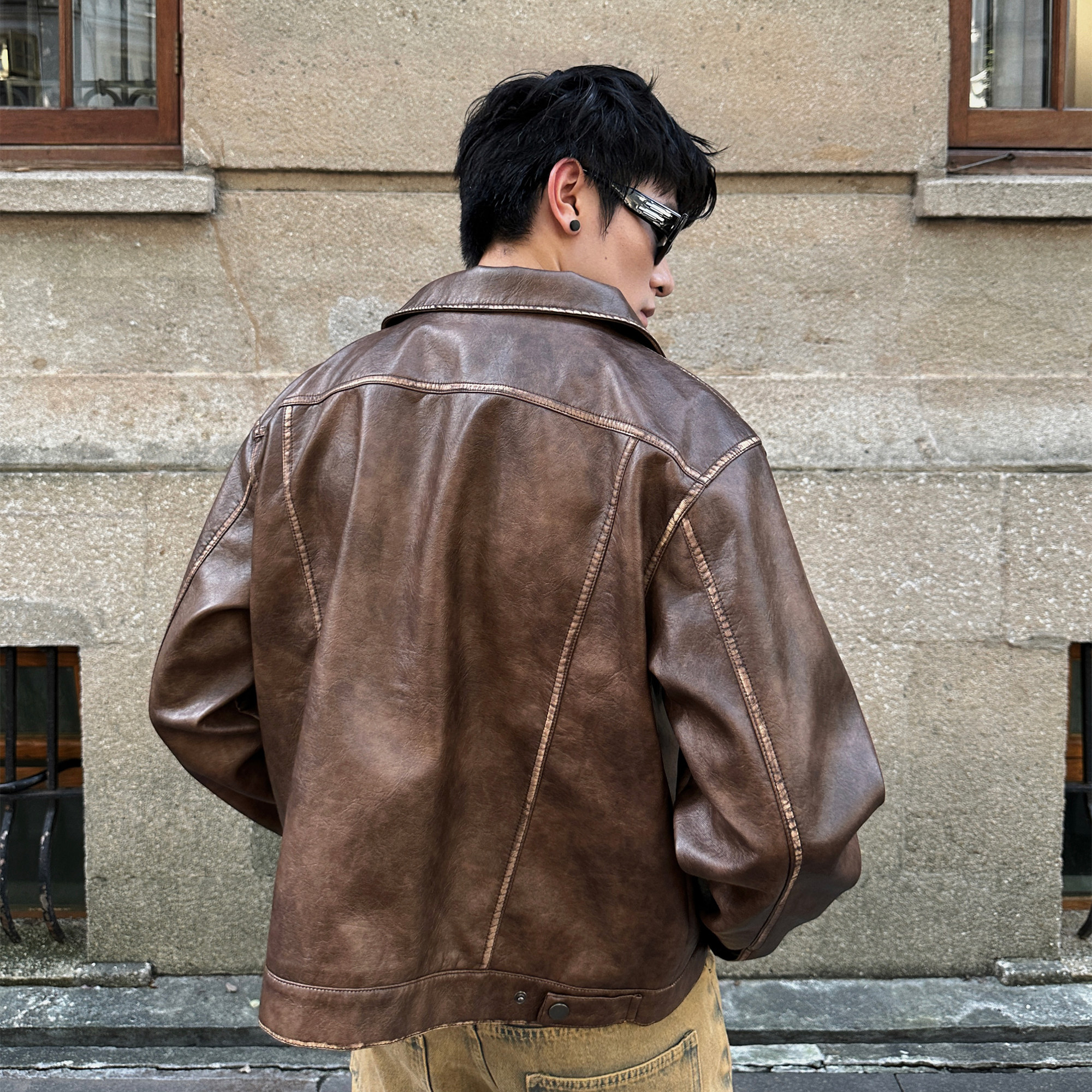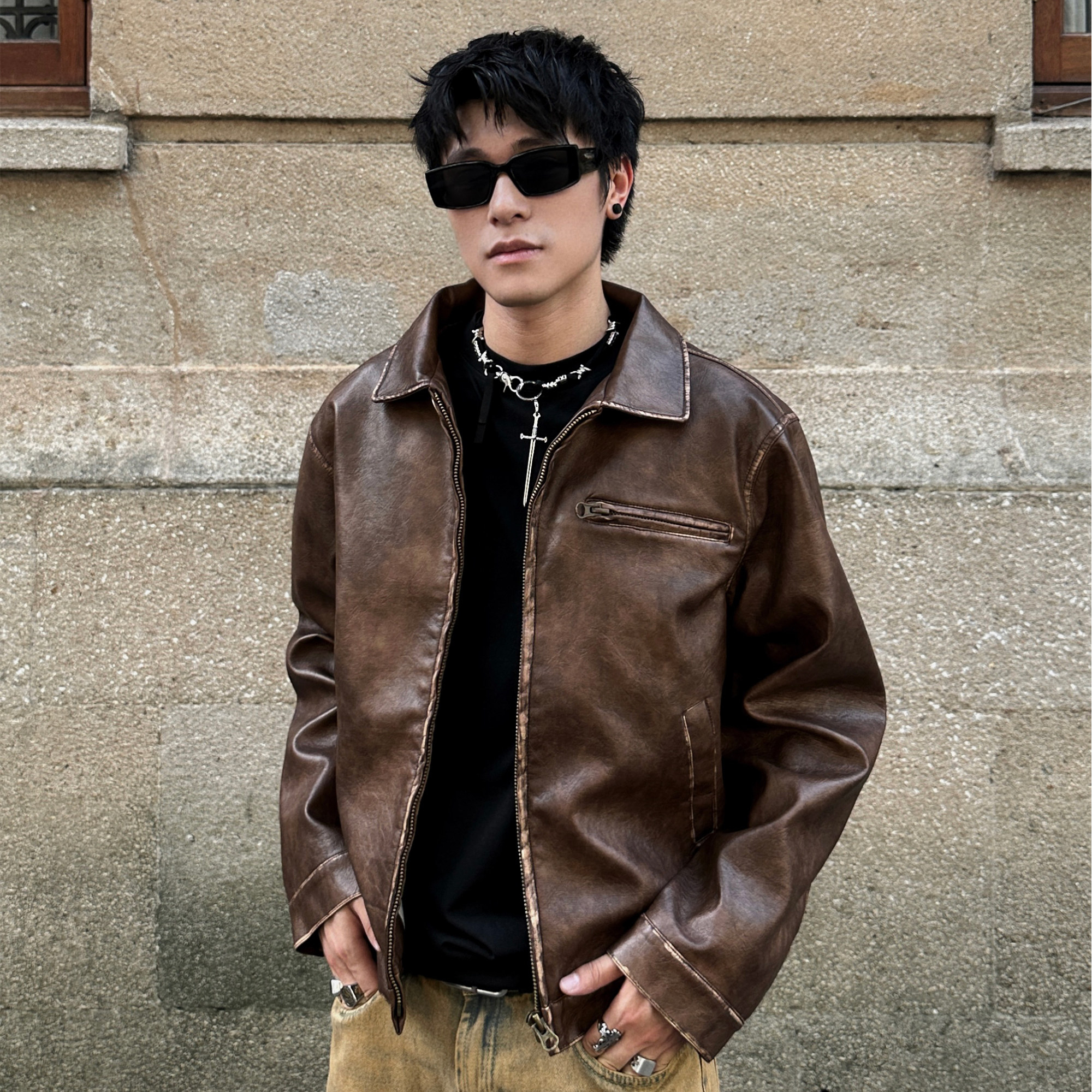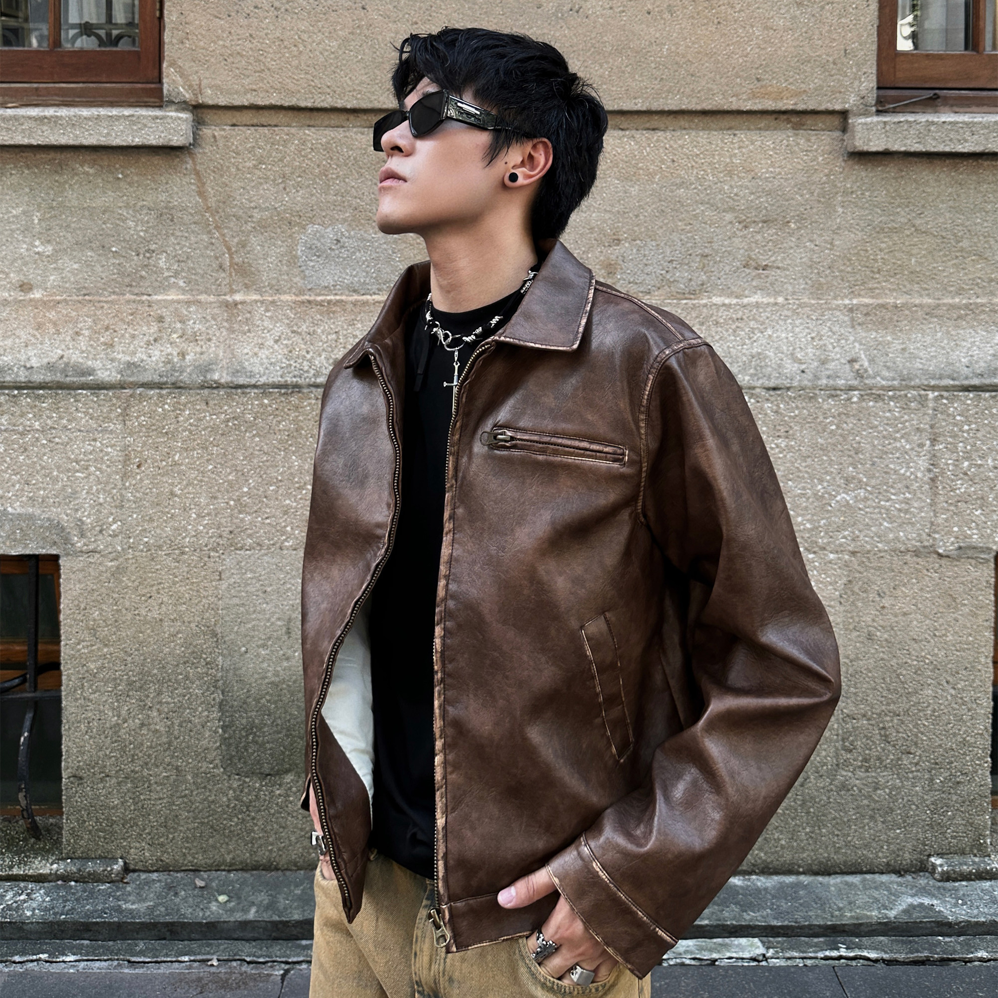 JDKZ美式复古美拉德棕色PU皮衣外套男秋季潮牌痞帅底特律立领夹克