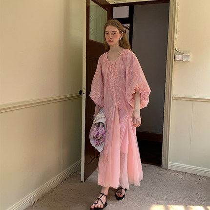 法式蕾丝薄纱中袖仙女连衣裙