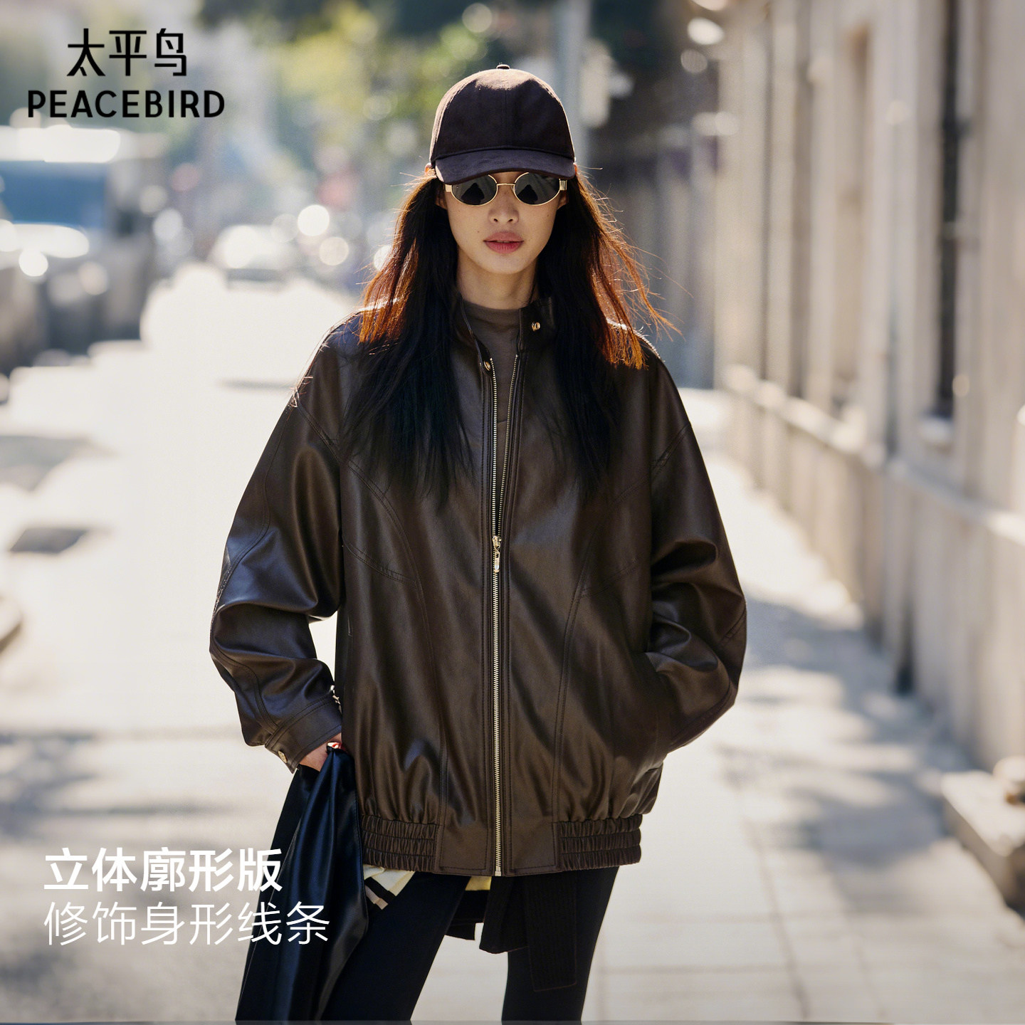 太平鸟早八夹克哑光肌理PU机车皮衣女复古廓形夹克外套女简约立领