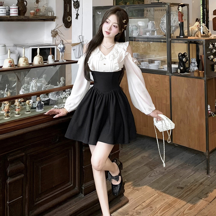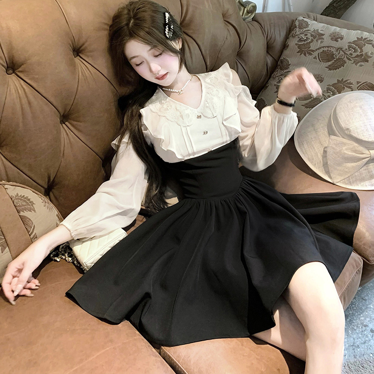 【威尔士画报】小黑裙掐腰撞色连衣裙女秋季新款千金感长袖露肩裙