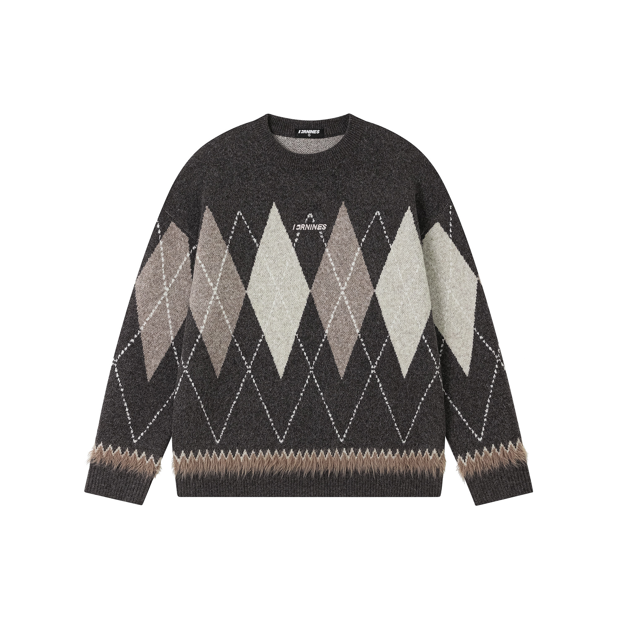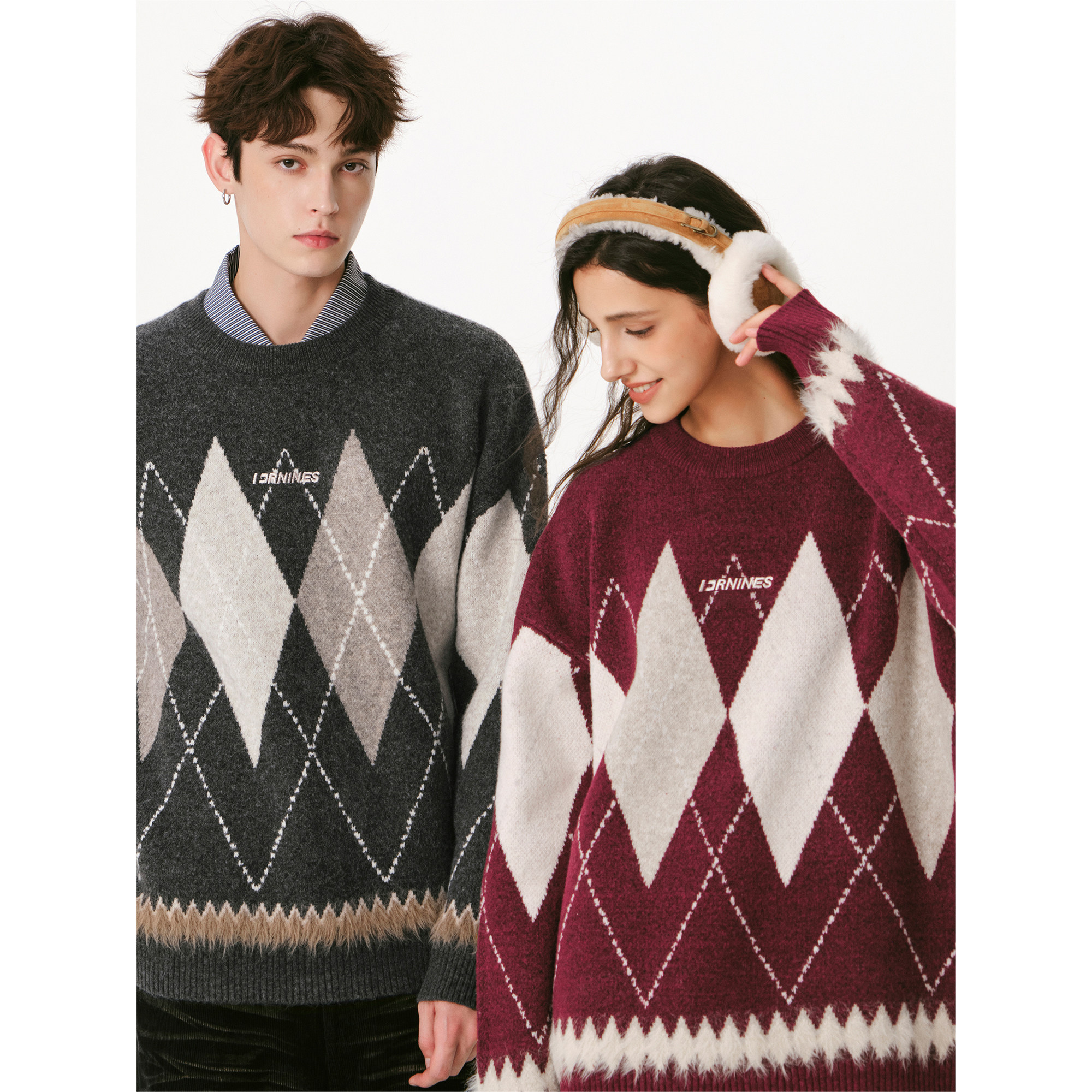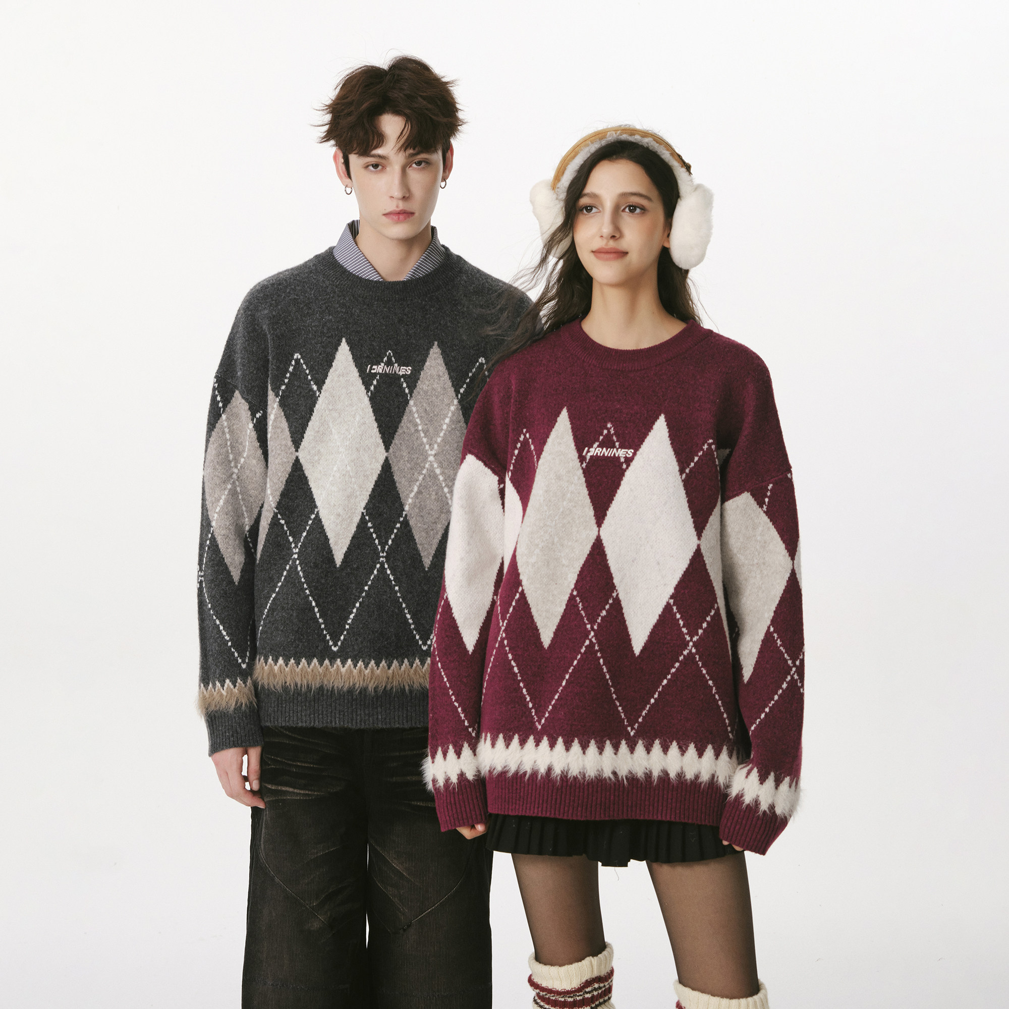 FORNINES含绵羊毛菱形格子毛衣男款秋冬季情侣毛线衣慵懒针织衫女
