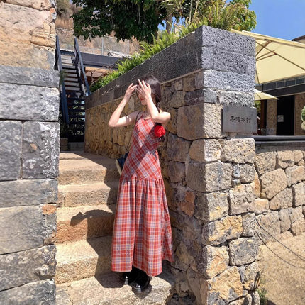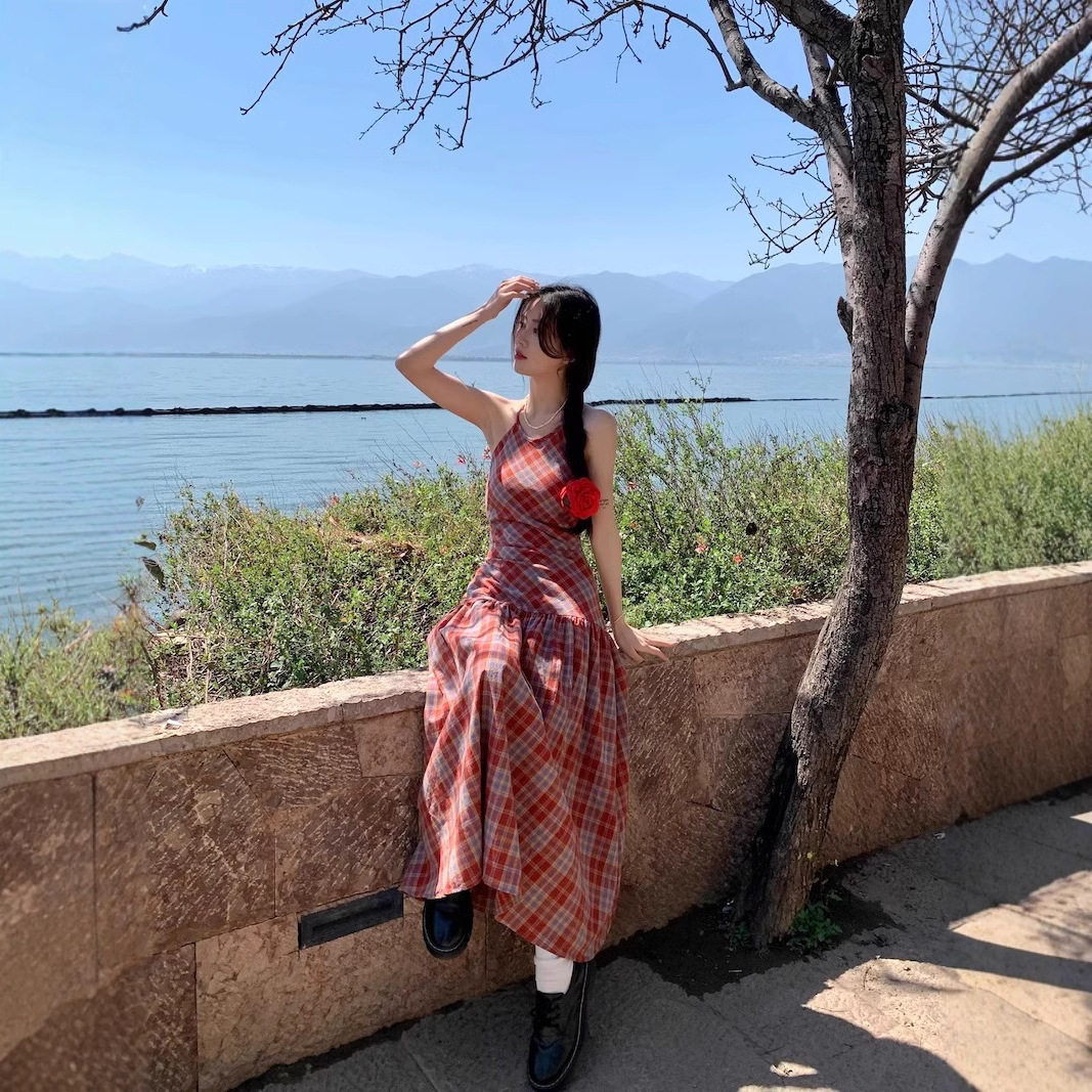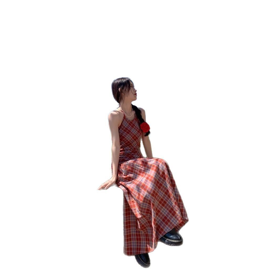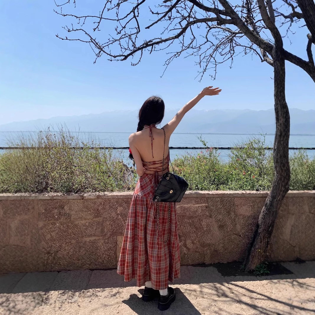 2025新款度假连衣裙夏季法式多巴胺甜美格纹露背挂脖系带连衣裙女