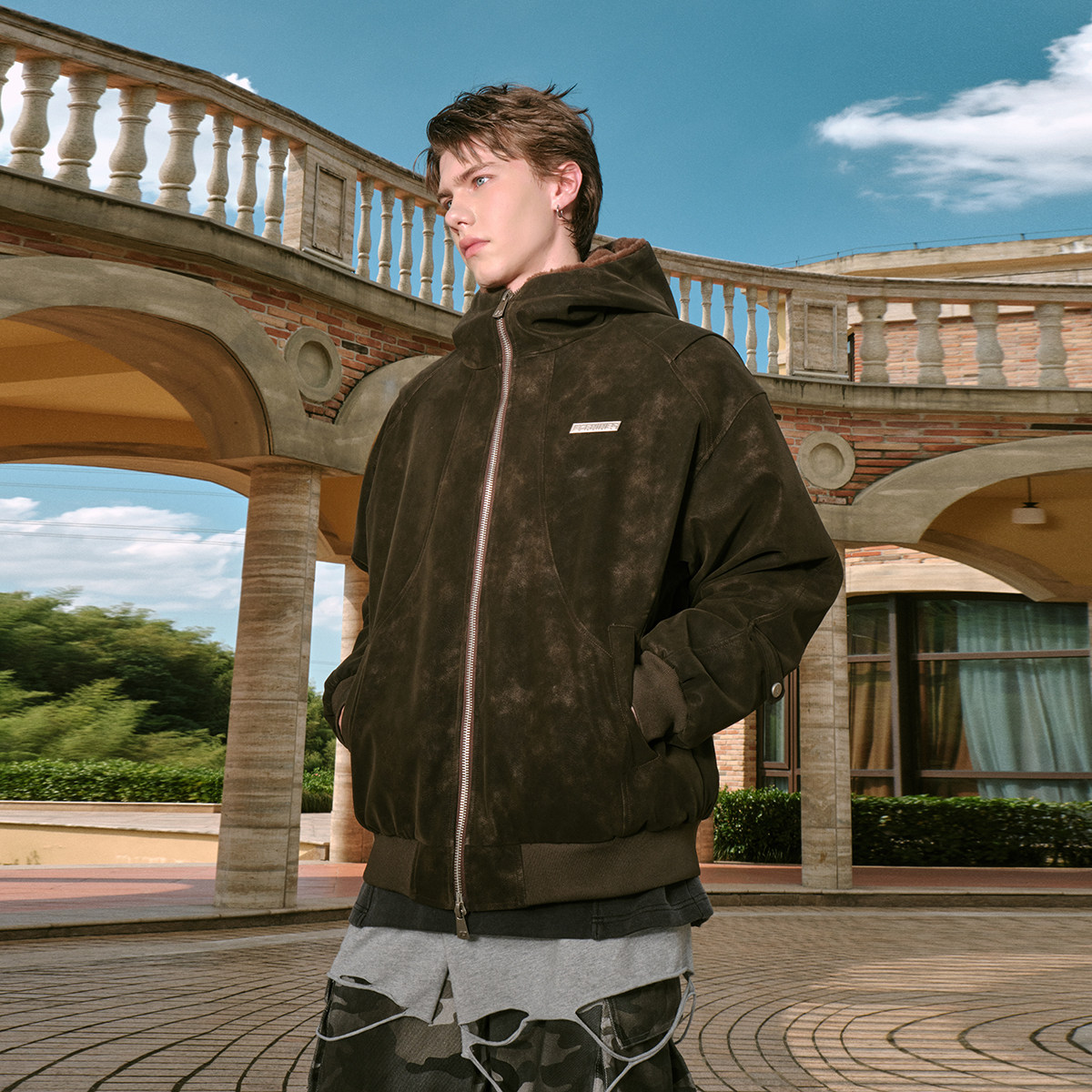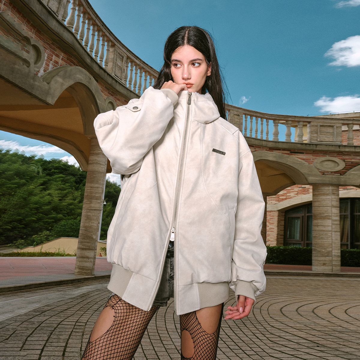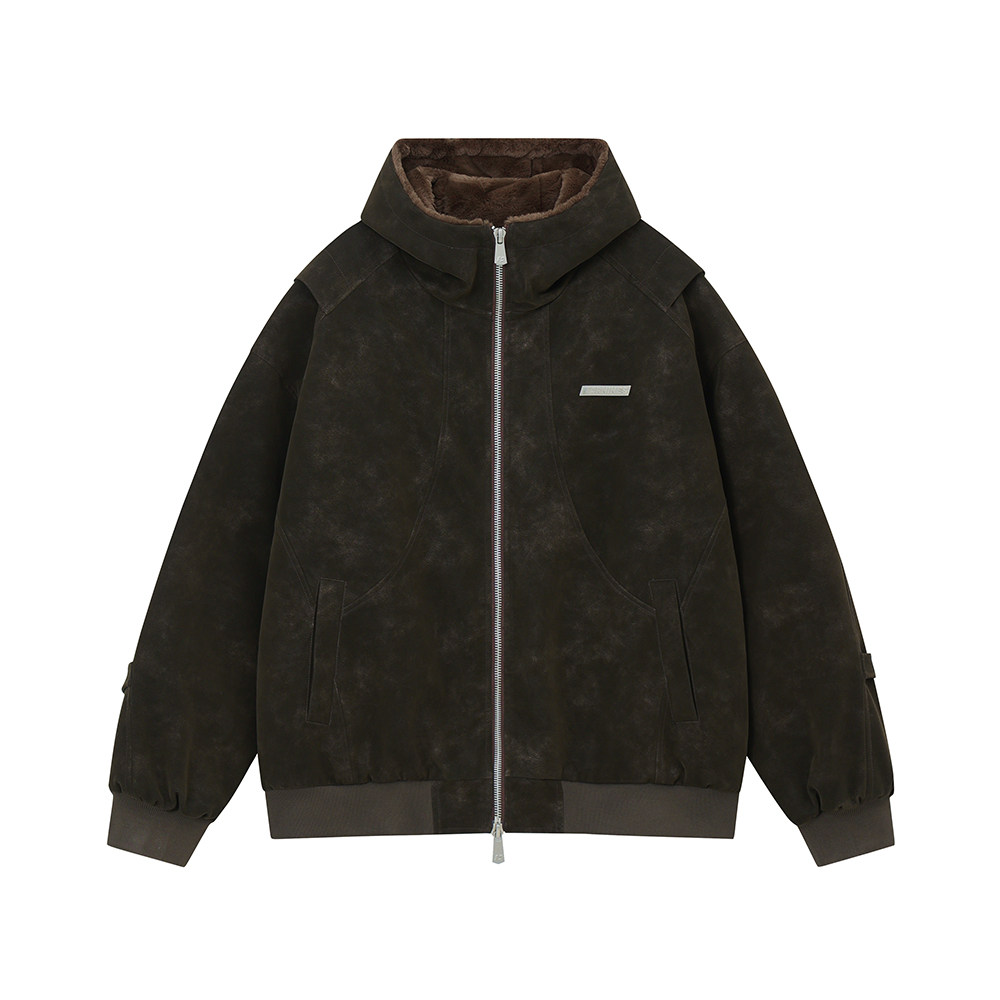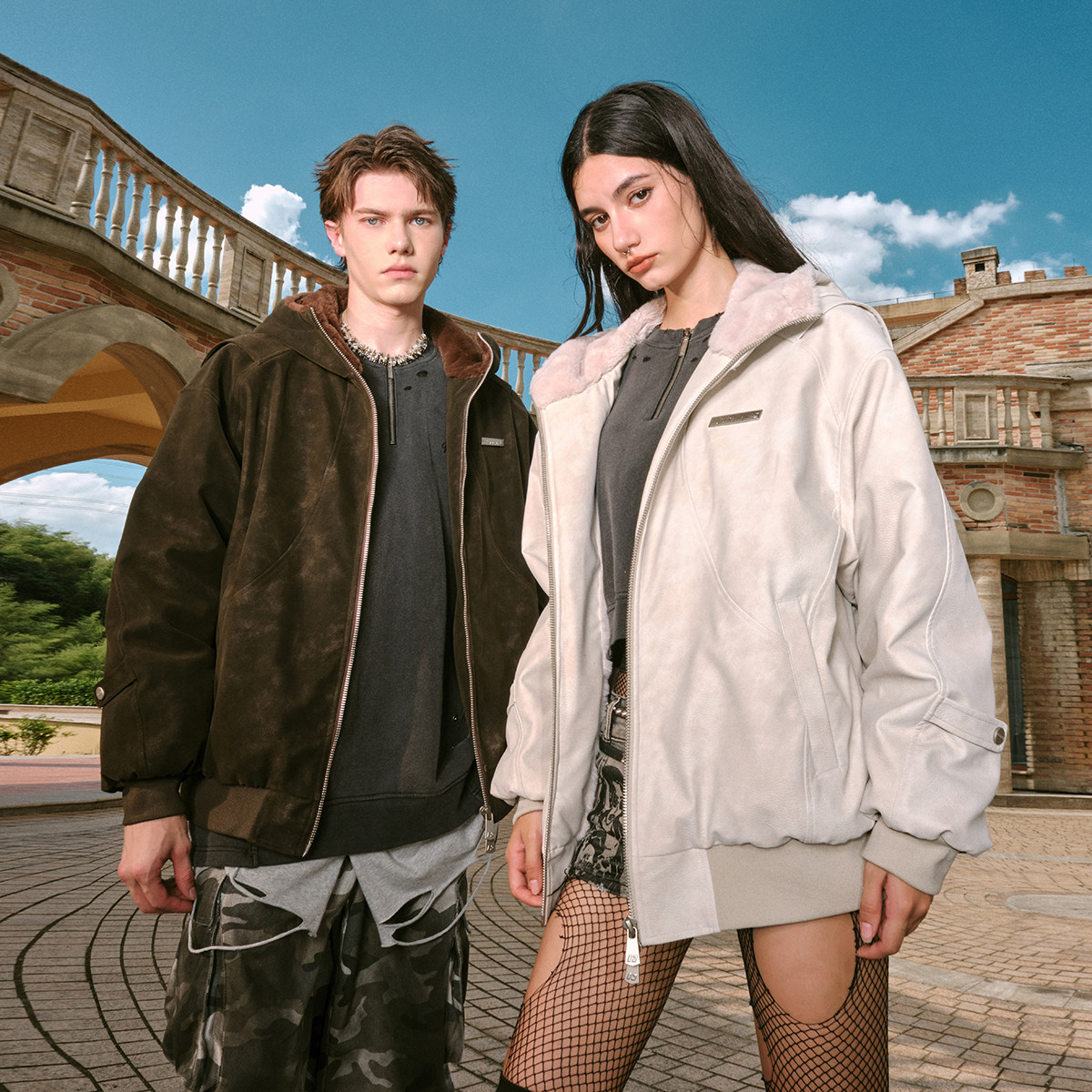 FORNINES加厚皮面棉衣男女潮牌冬季仿獭兔毛美式复古加绒夹克外套