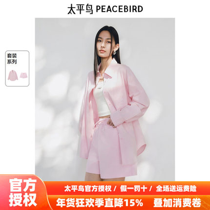 太平鸟 25秋季新款女士秋日粉色阔形肌理感长袖衬衫抽绳短裤组合
