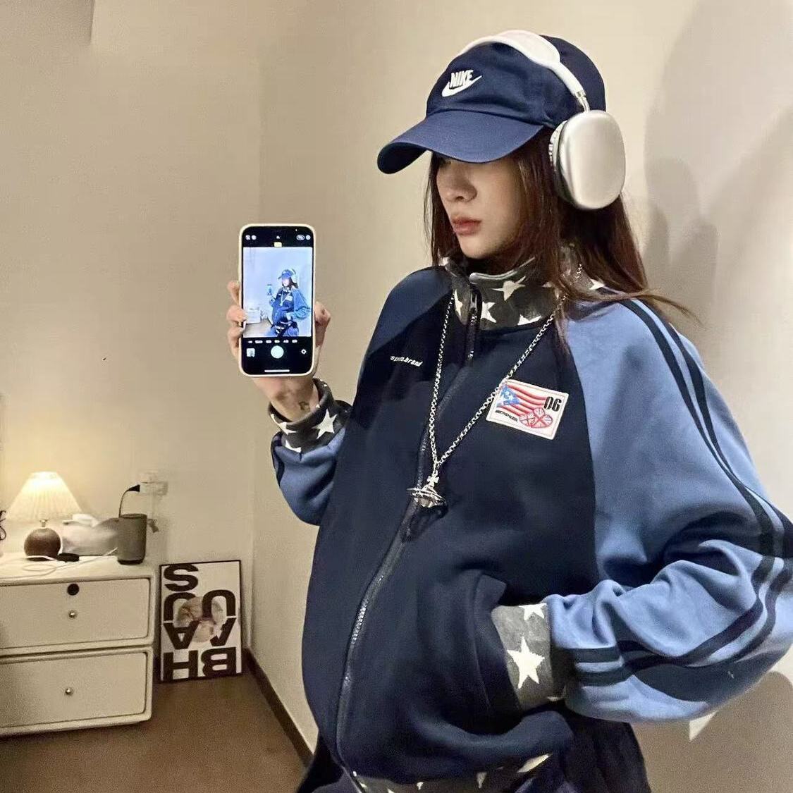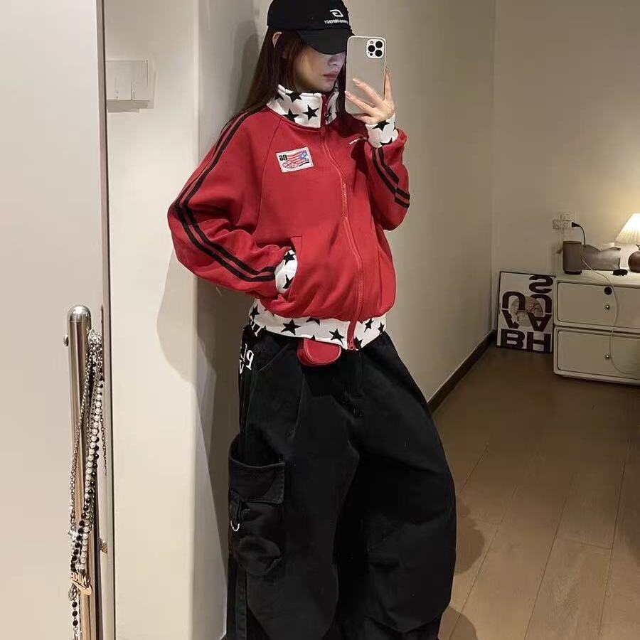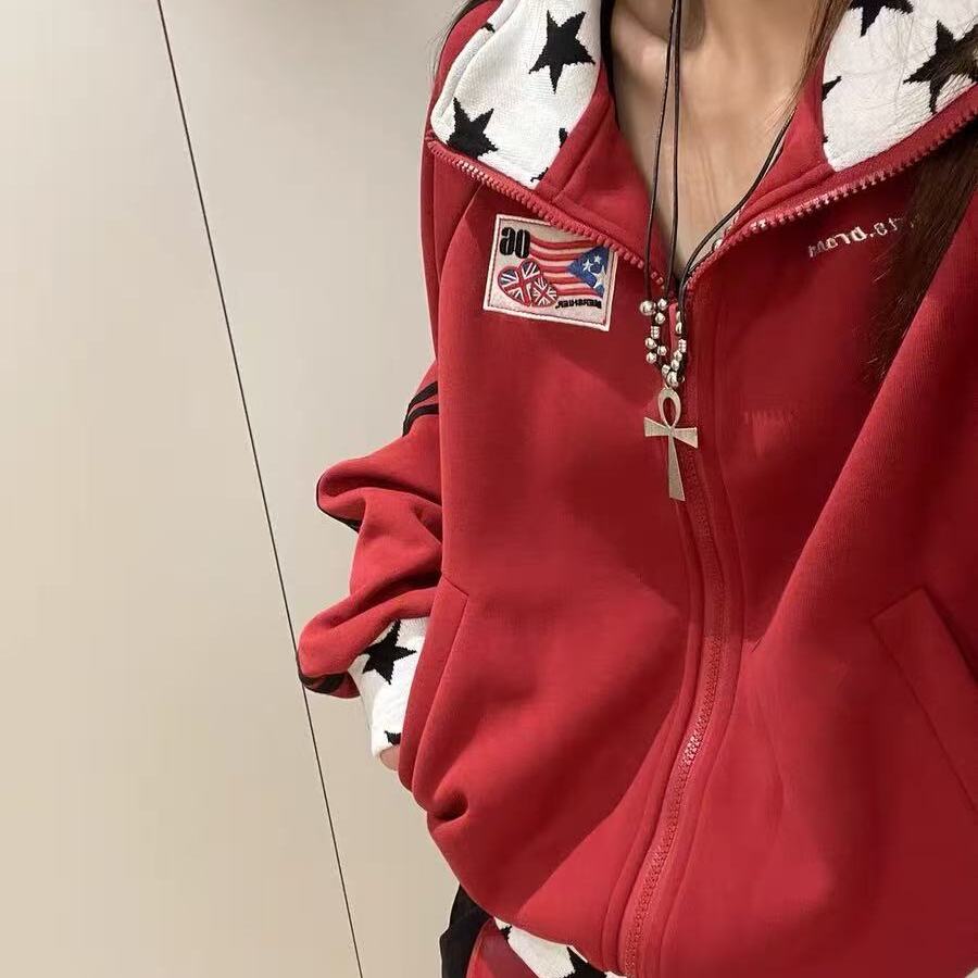 撞色拼接星星立领美式开衫红色卫衣外套女秋季休闲运动短款上衣