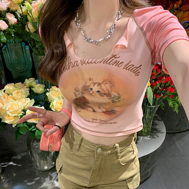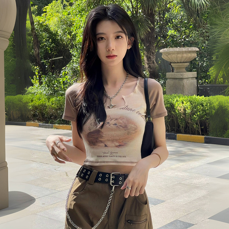 甜辣妹纯欲风猫咪印花短袖T恤女夏ins设计感性感短款显瘦修身上衣