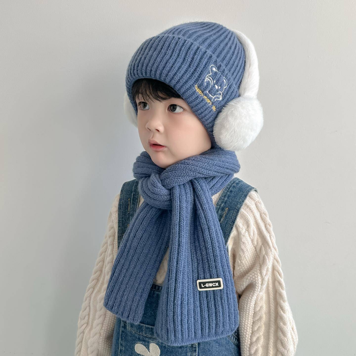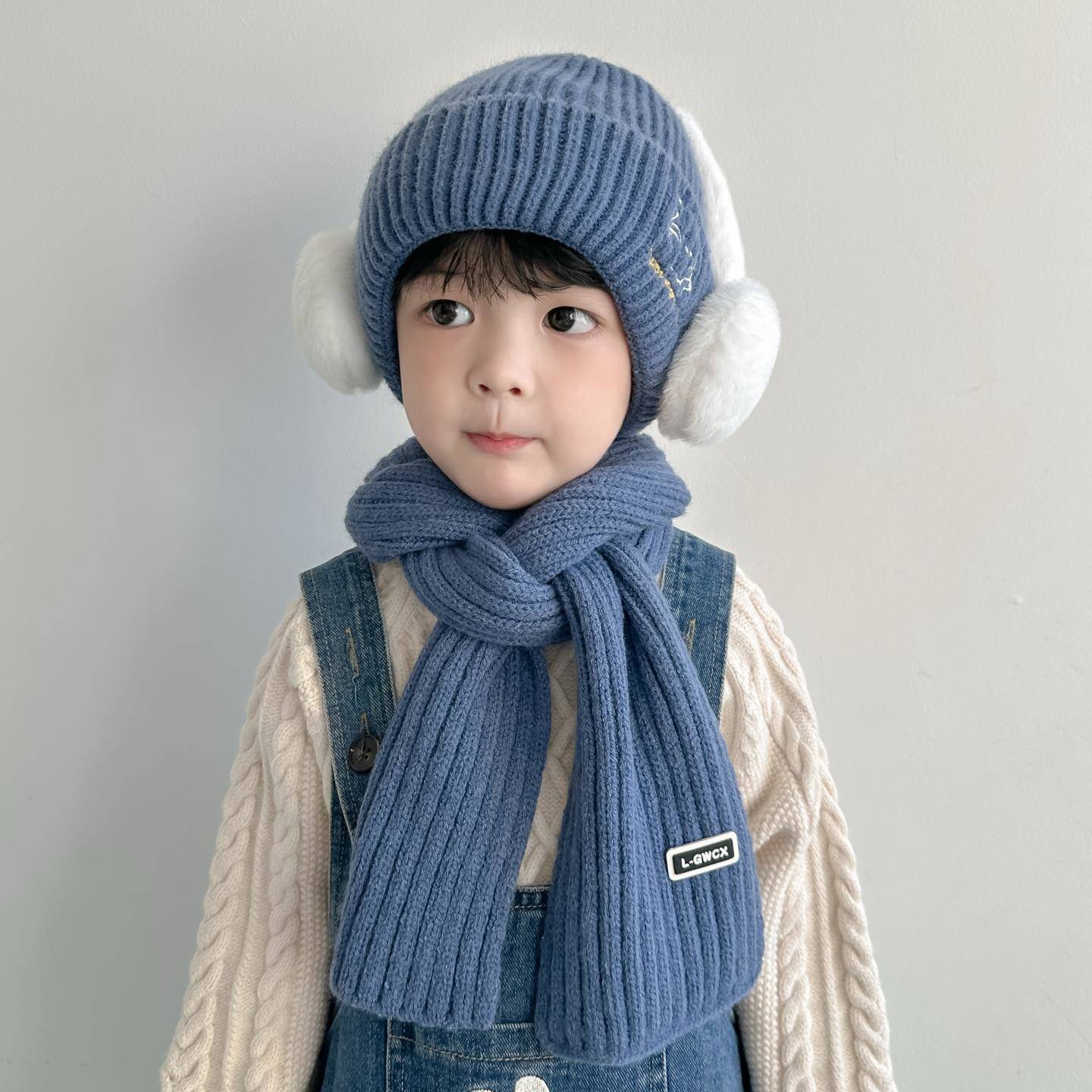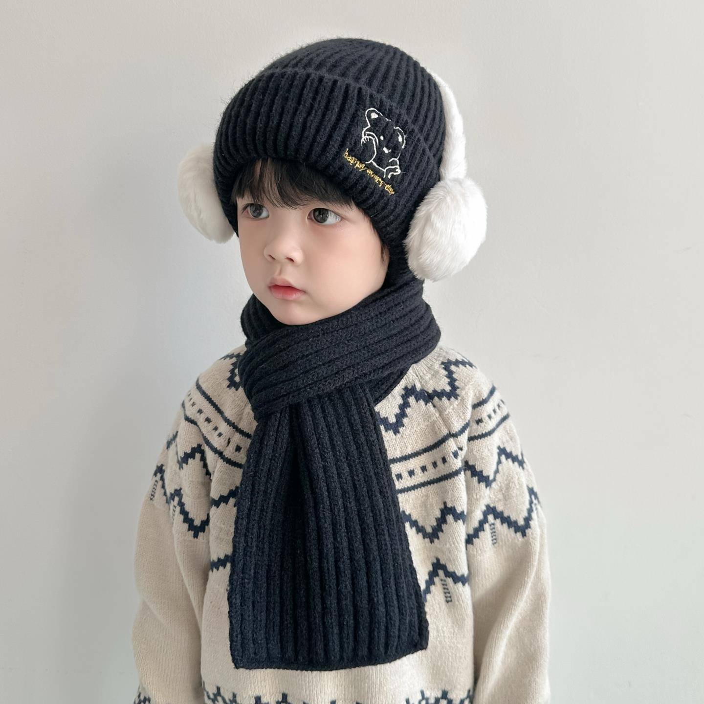 2025新款儿童帽子围巾二件套秋冬韩版男童护耳帽女童加厚保暖毛线