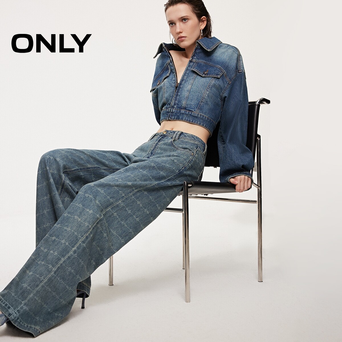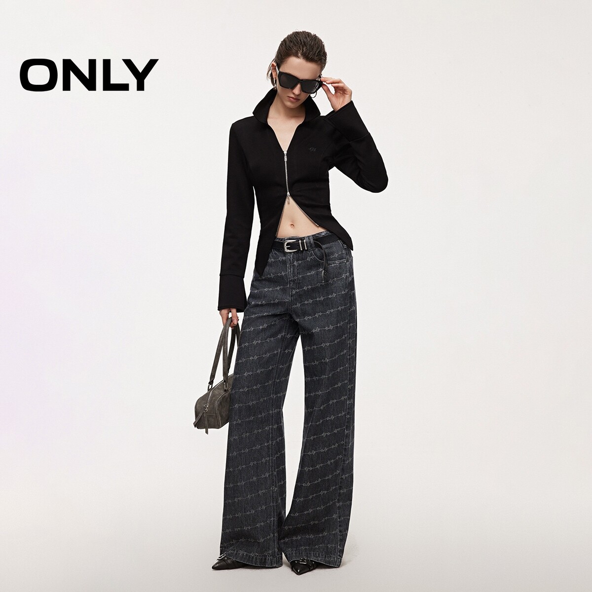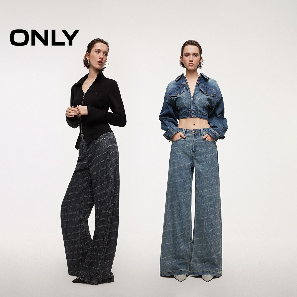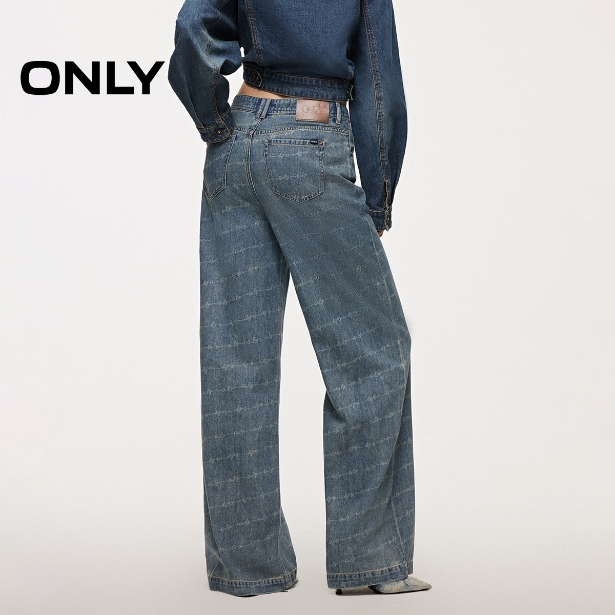 ONLY2025冬季新款高腰约克剪裁显瘦满印印花纯棉直筒牛仔裤女