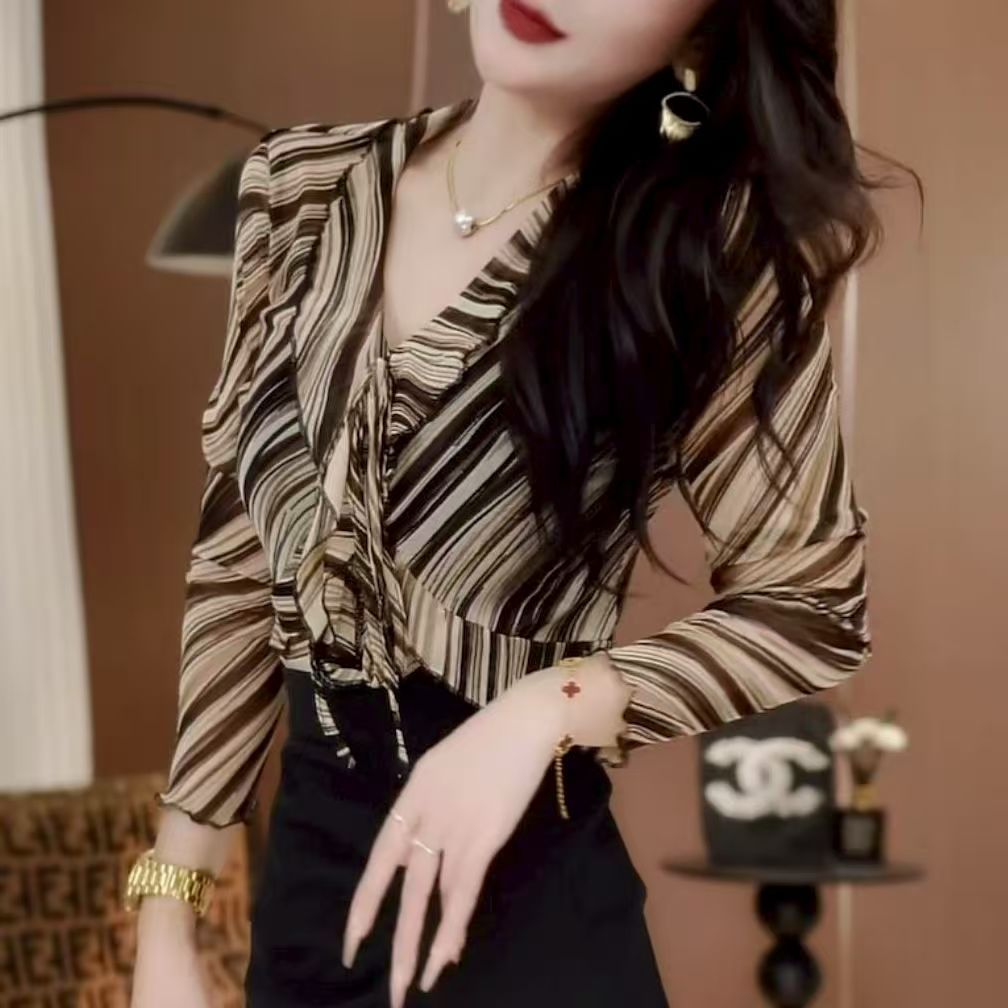 法式洋气网纱长袖小衫上衣女2025春夏新百搭时尚显瘦衬衫印花外穿