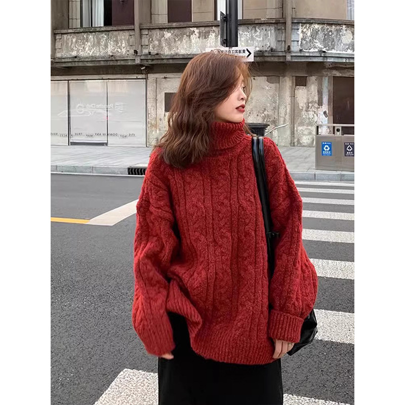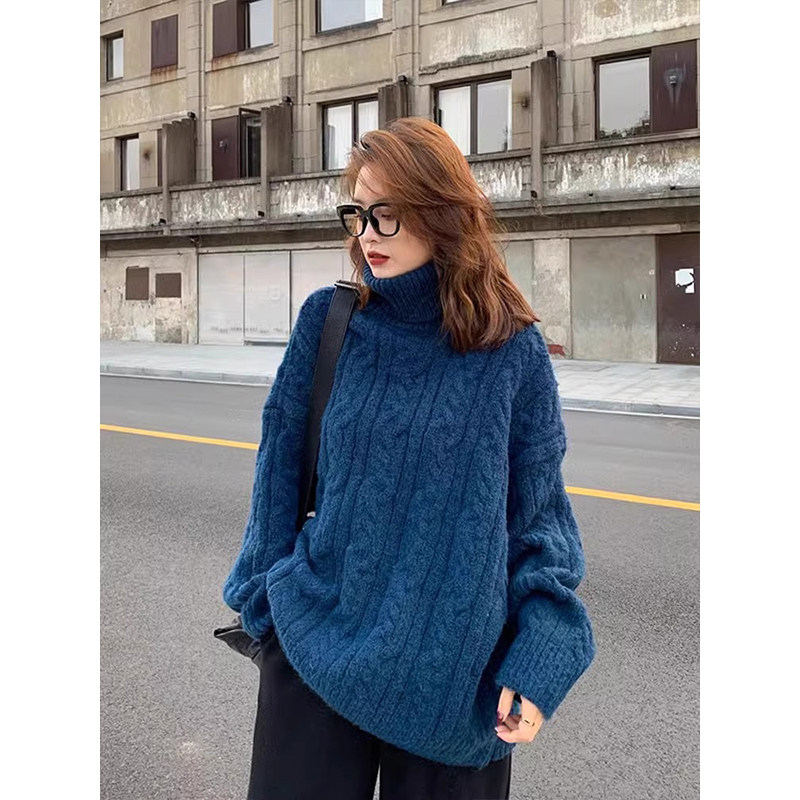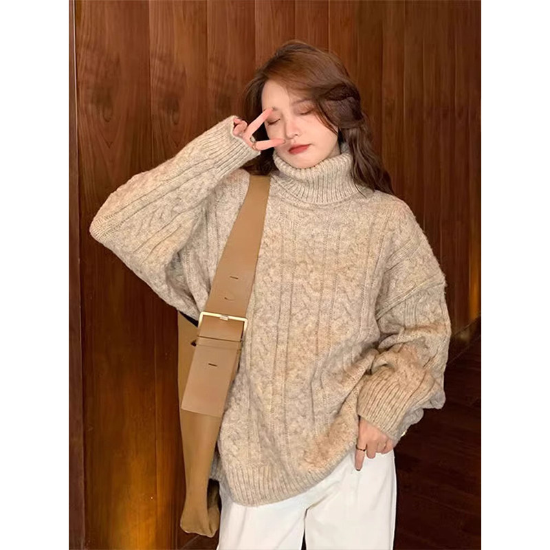 高级感黑色麻花高领毛衣女秋冬慵懒风宽松加厚内搭针织羊毛衫上衣
