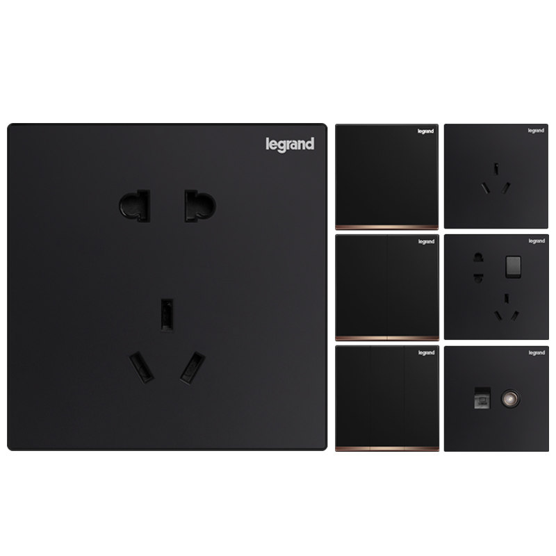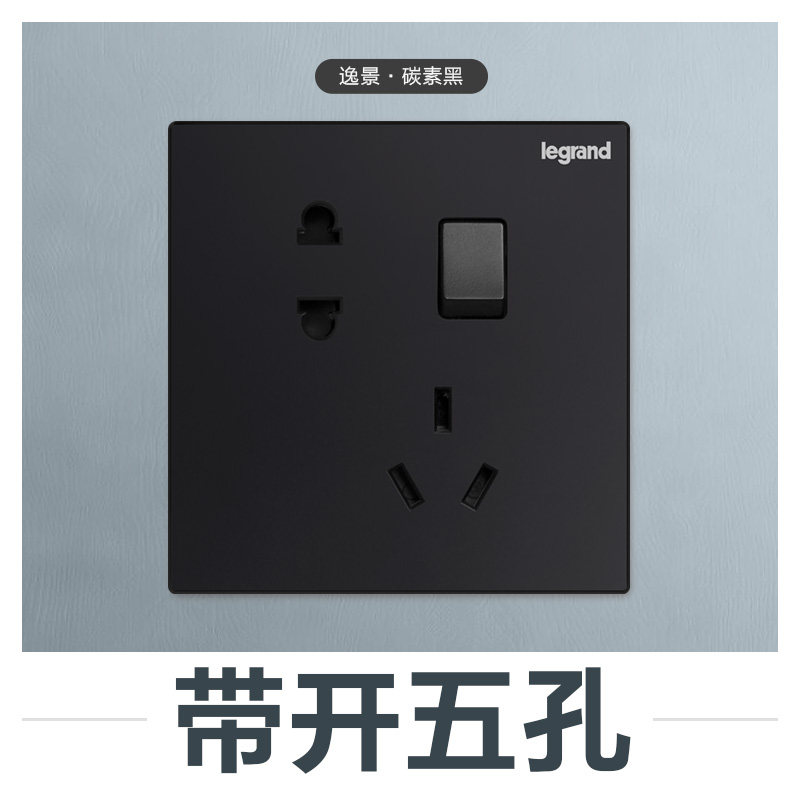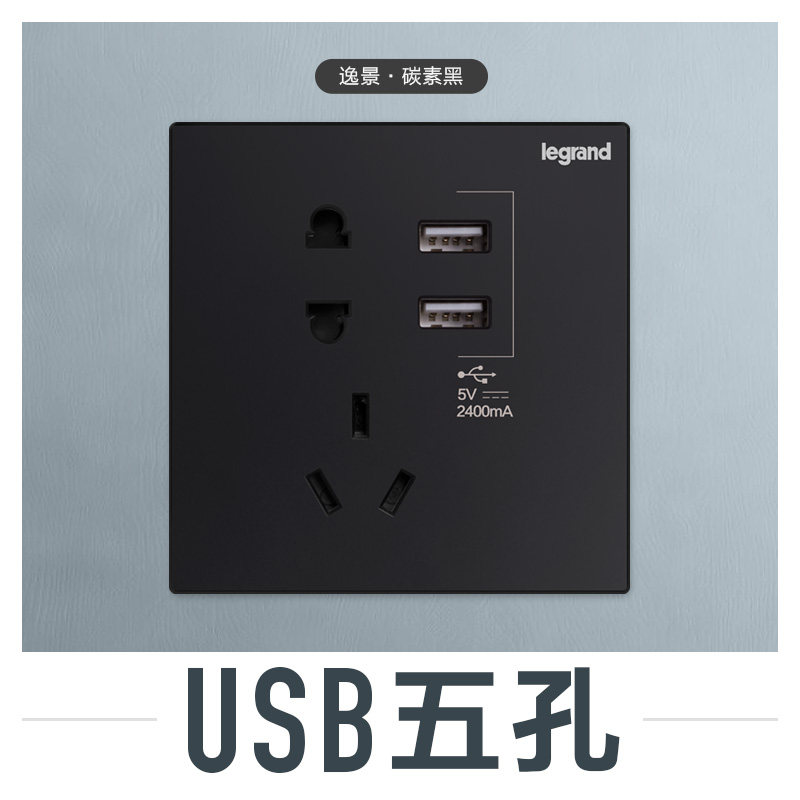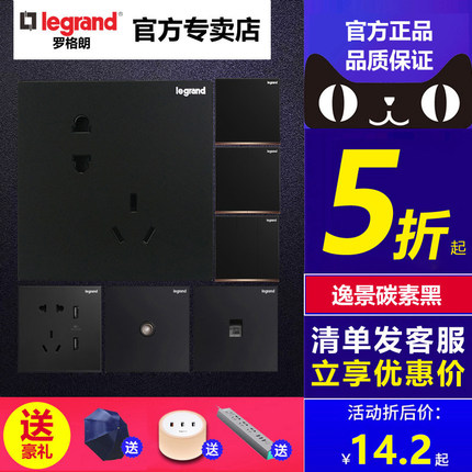 罗格朗开关插座逸景碳素黑色一开五孔插座带USB墙壁电源二三孔5孔