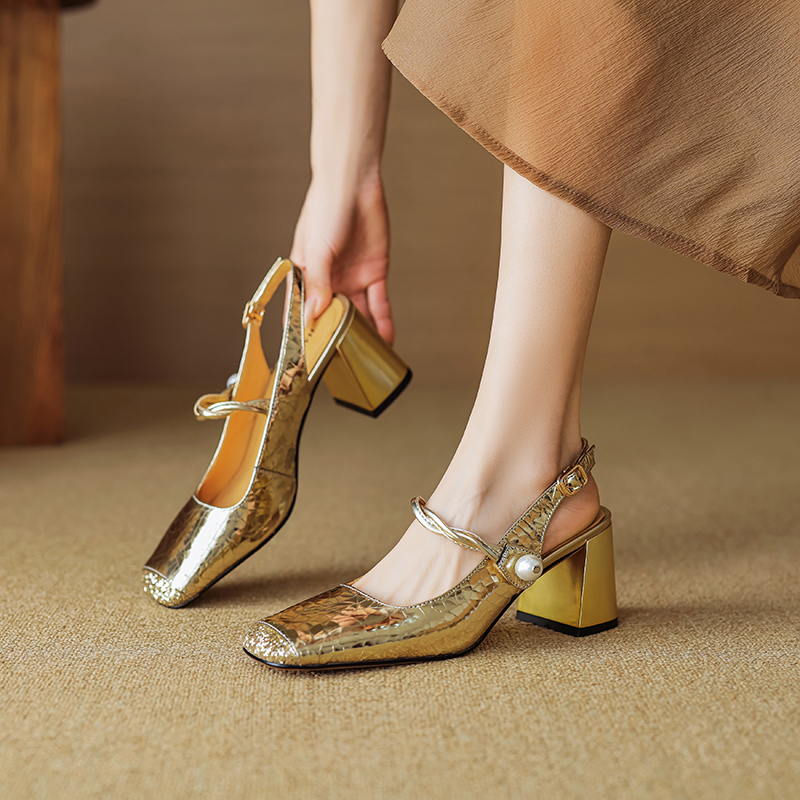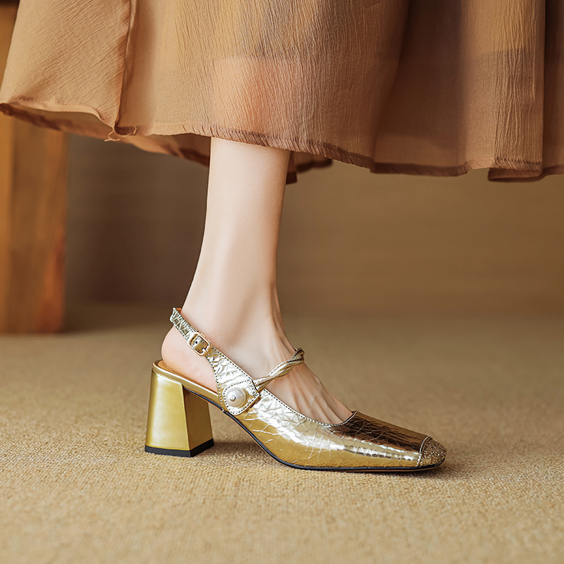 极简法式粗跟包头凉鞋女夏银色方头一字带高跟鞋真皮后空玛丽珍鞋