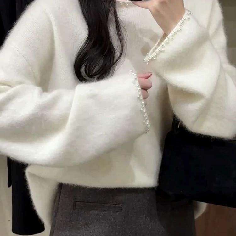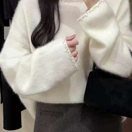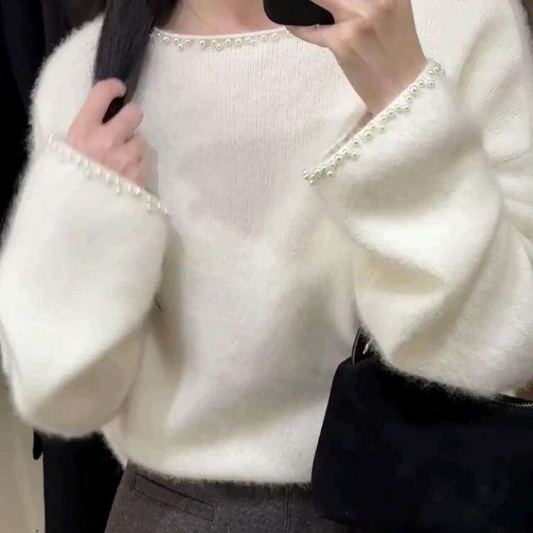 艺术生白色钉珠重工套头毛衣女秋冬奶fufu软糯慵懒小香风内搭上衣