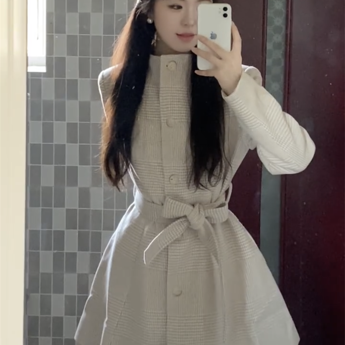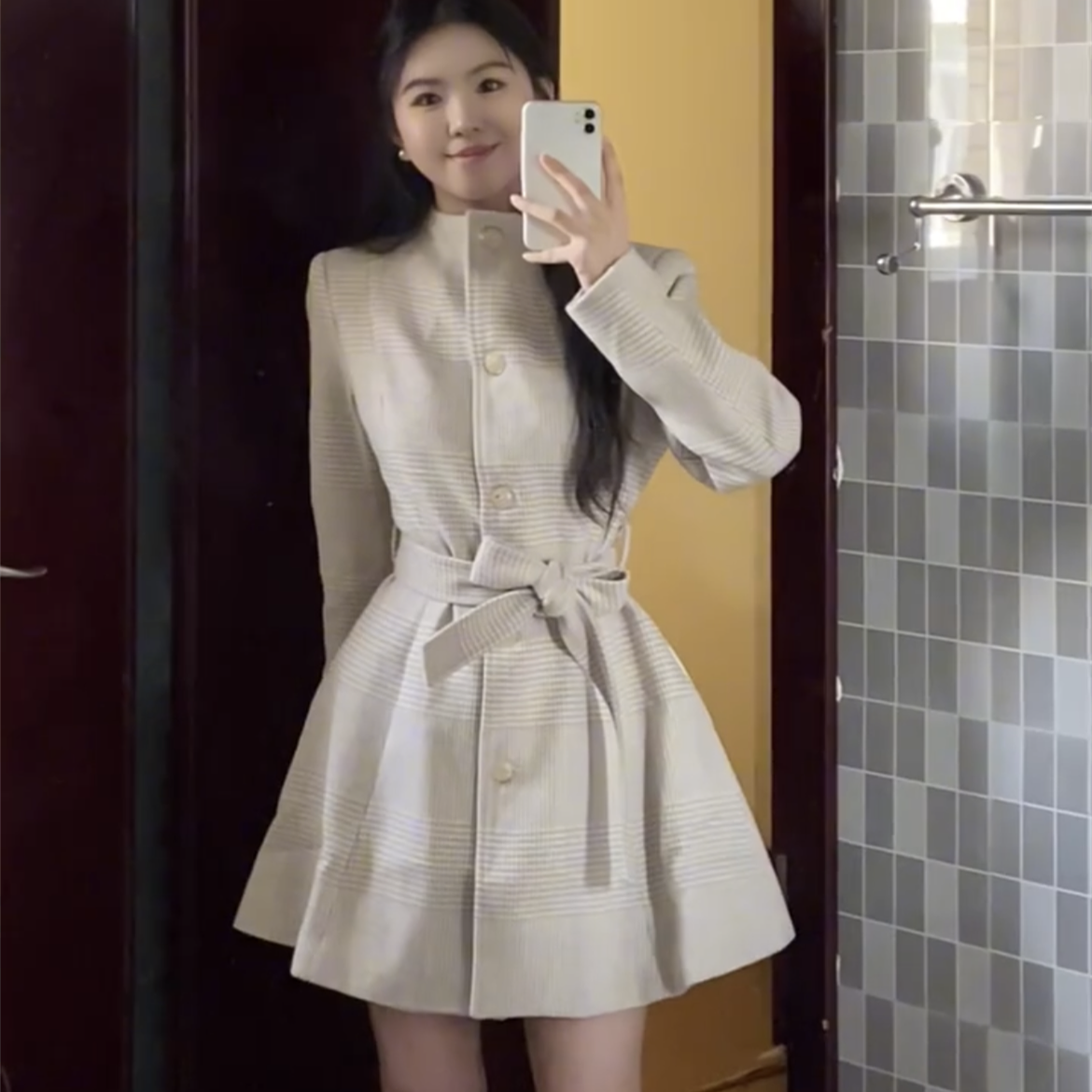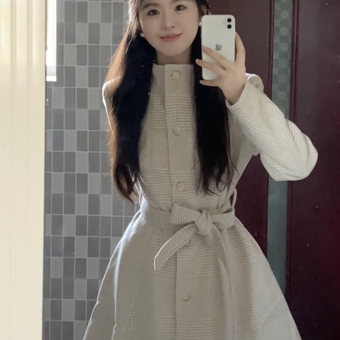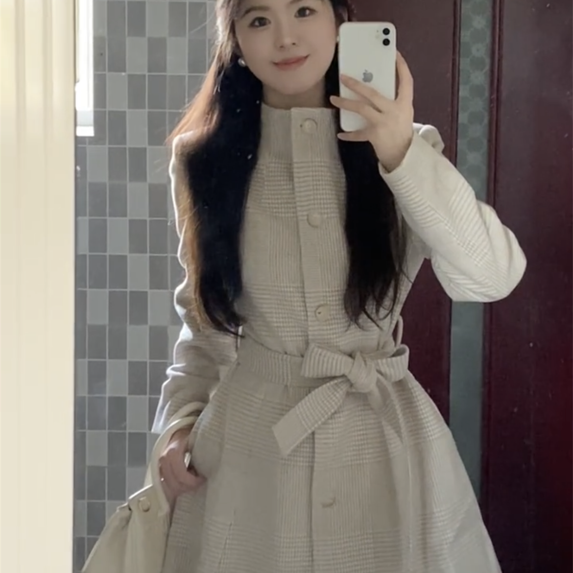 富家千金风立领中长款呢子大衣女秋冬高级感气质系带收腰毛呢外套