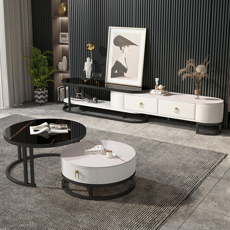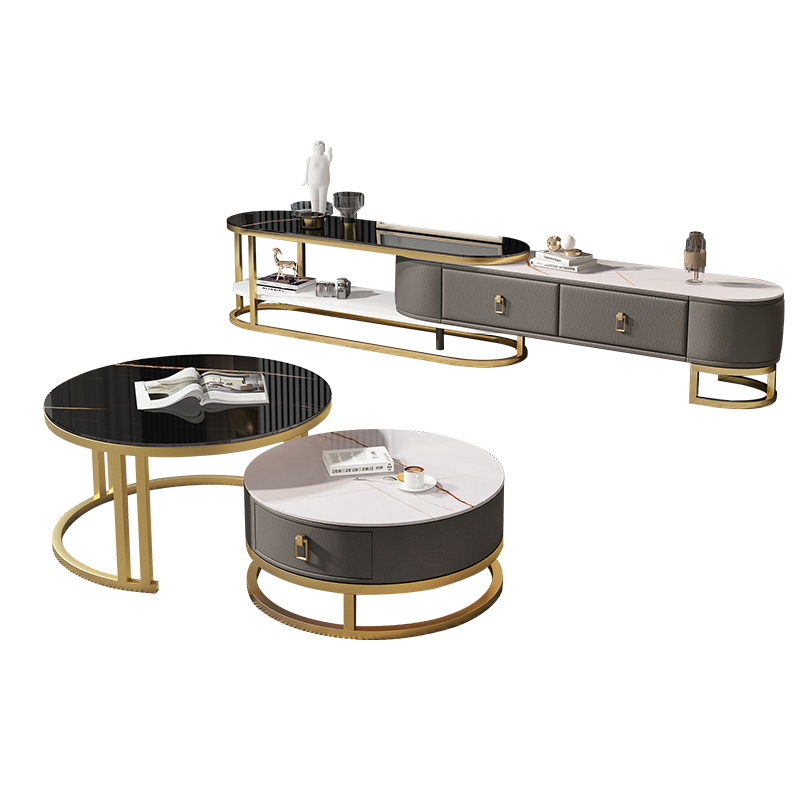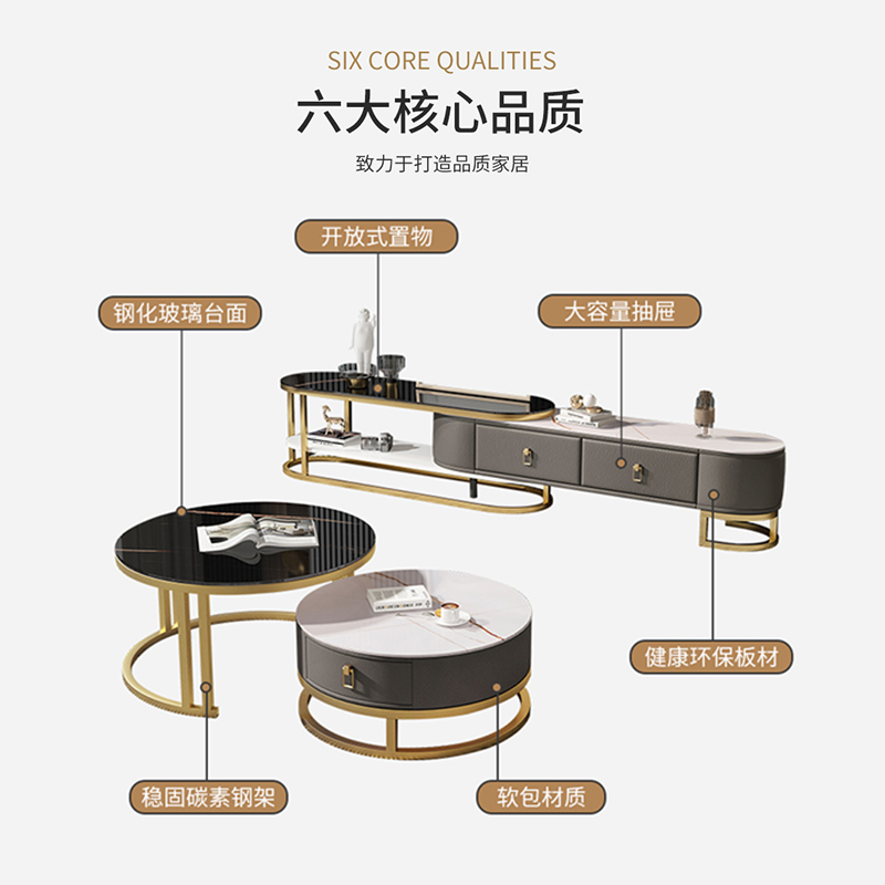 轻奢茶几电视柜组合可伸缩岩板现代简约小户型客厅家用圆形茶几桌