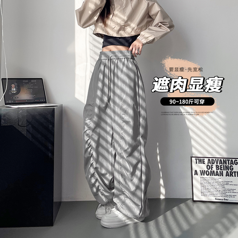 降落伞兵裤女秋季大码胖mm褶皱阔腿休闲工装裤酷飒高腰显瘦裤子