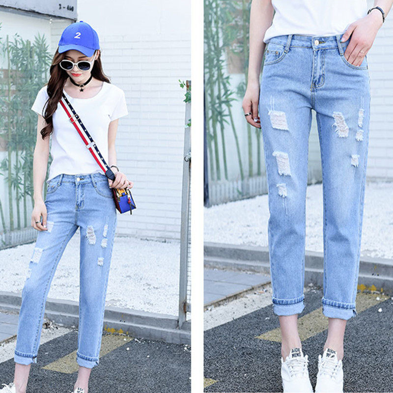 破洞牛仔裤女宽松九分裤2023新款韩版显瘦学生高腰bf乞丐哈伦裤子