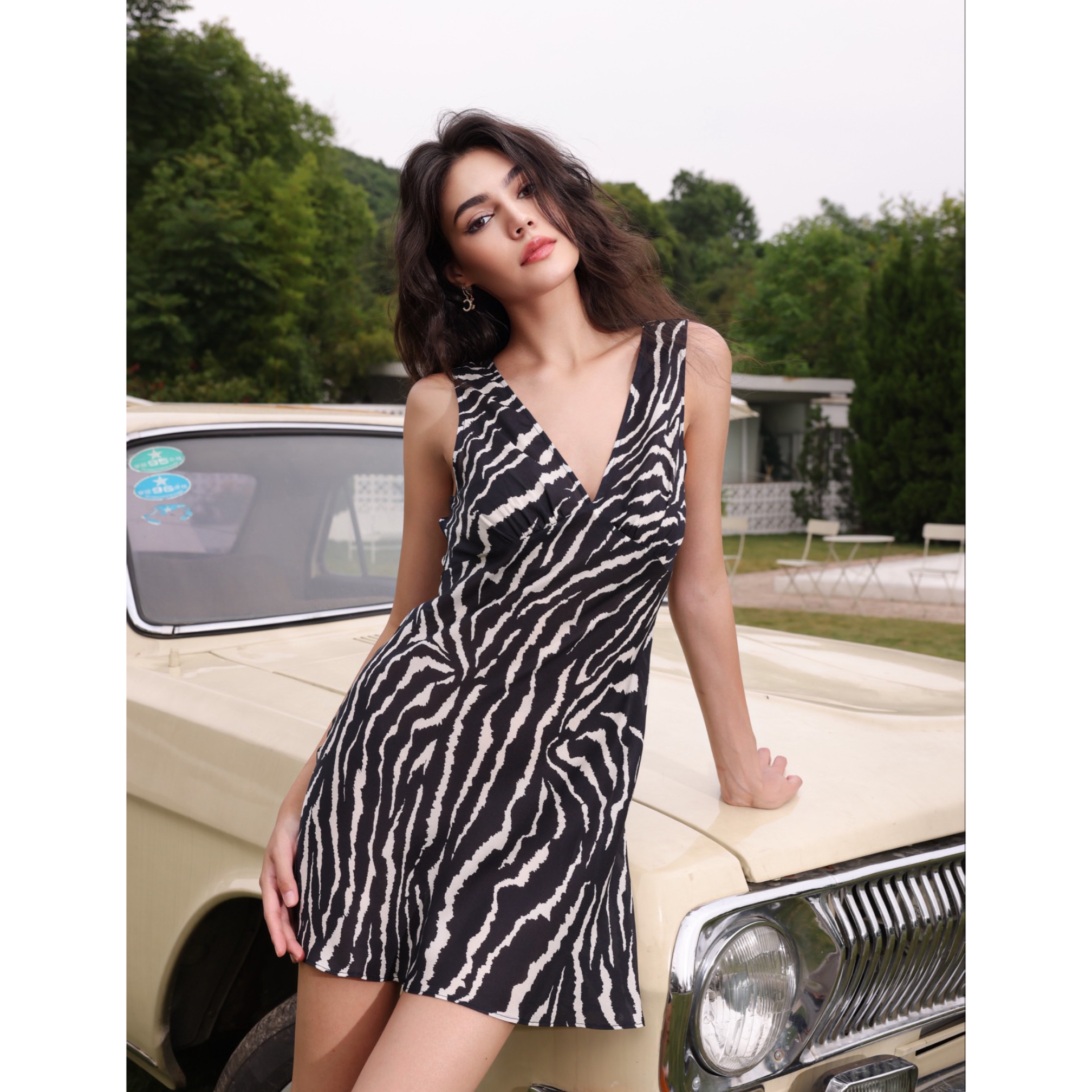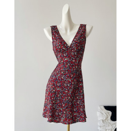 雪绿 V领短款系列 真丝小碎花连衣裙 2025夏法式轻奢无袖短裙