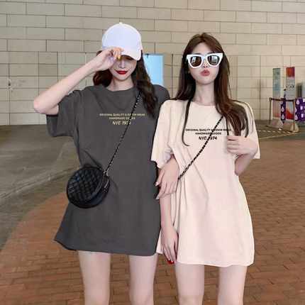中长款大版短袖t恤女夏季2025年新款宽松百搭纯棉半袖字母上衣ins