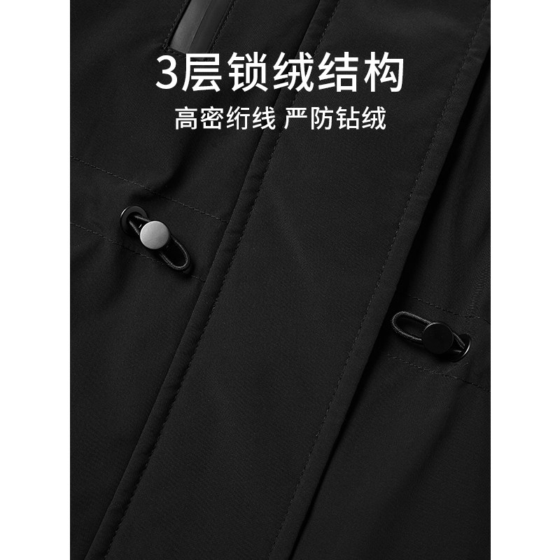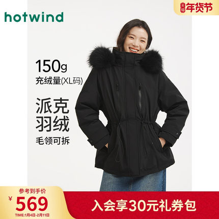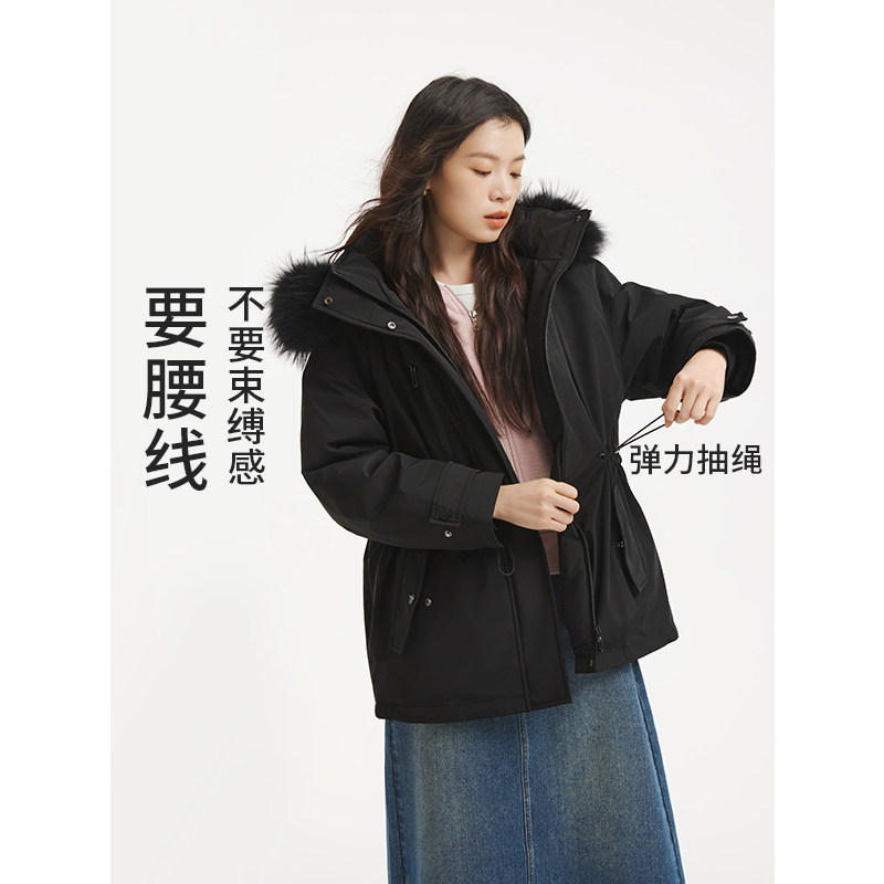 热风女士派克羽绒服2025年冬季新款时尚大毛领抽绳显瘦黑色羽绒服