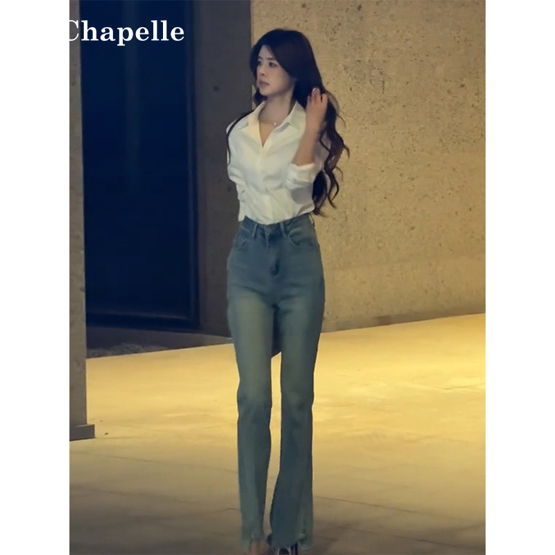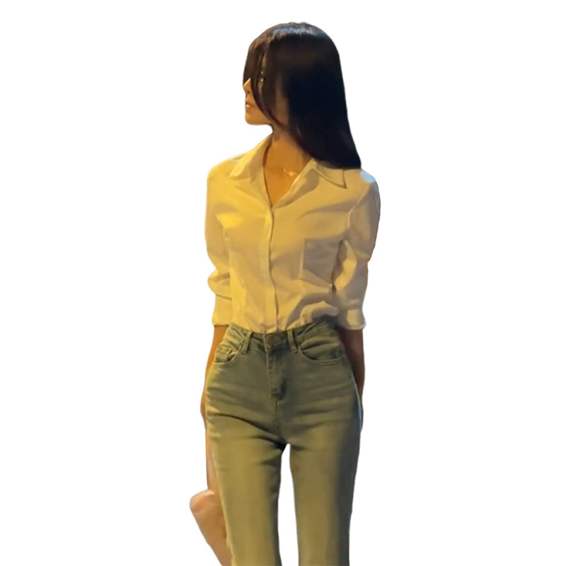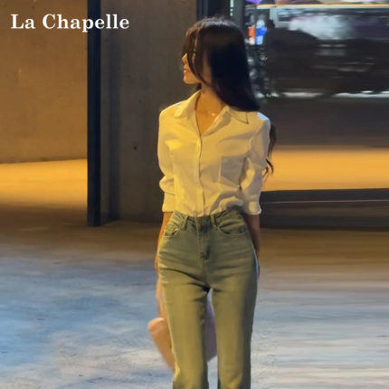 拉夏贝尔通勤正装白色长袖衬衫夏季新款收腰衬衫polo领女士上衣