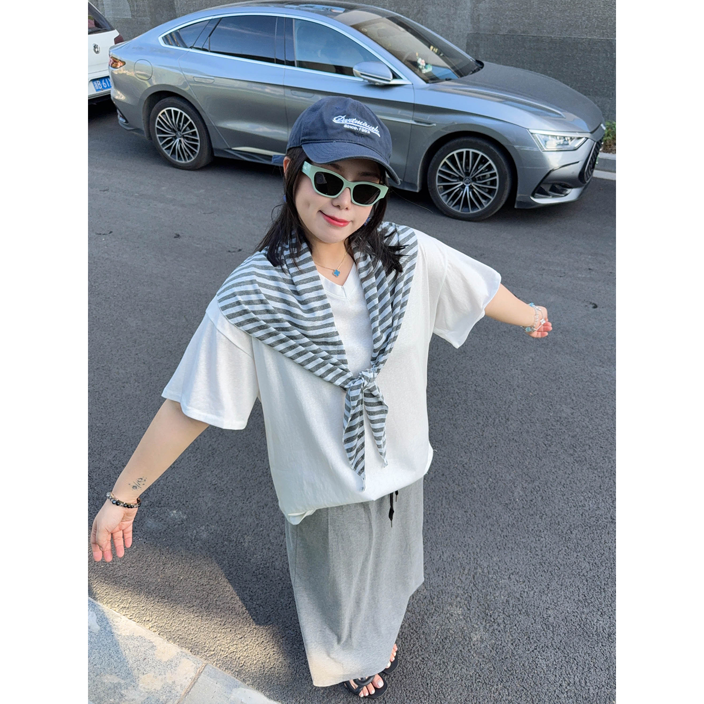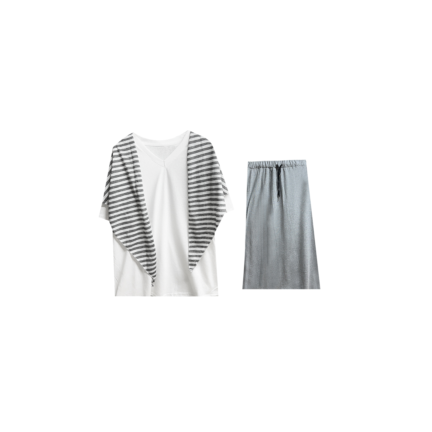 VOGANA戛纳家大码女装韩系素颜套装慵懒松弛简约披肩t恤半身裙夏