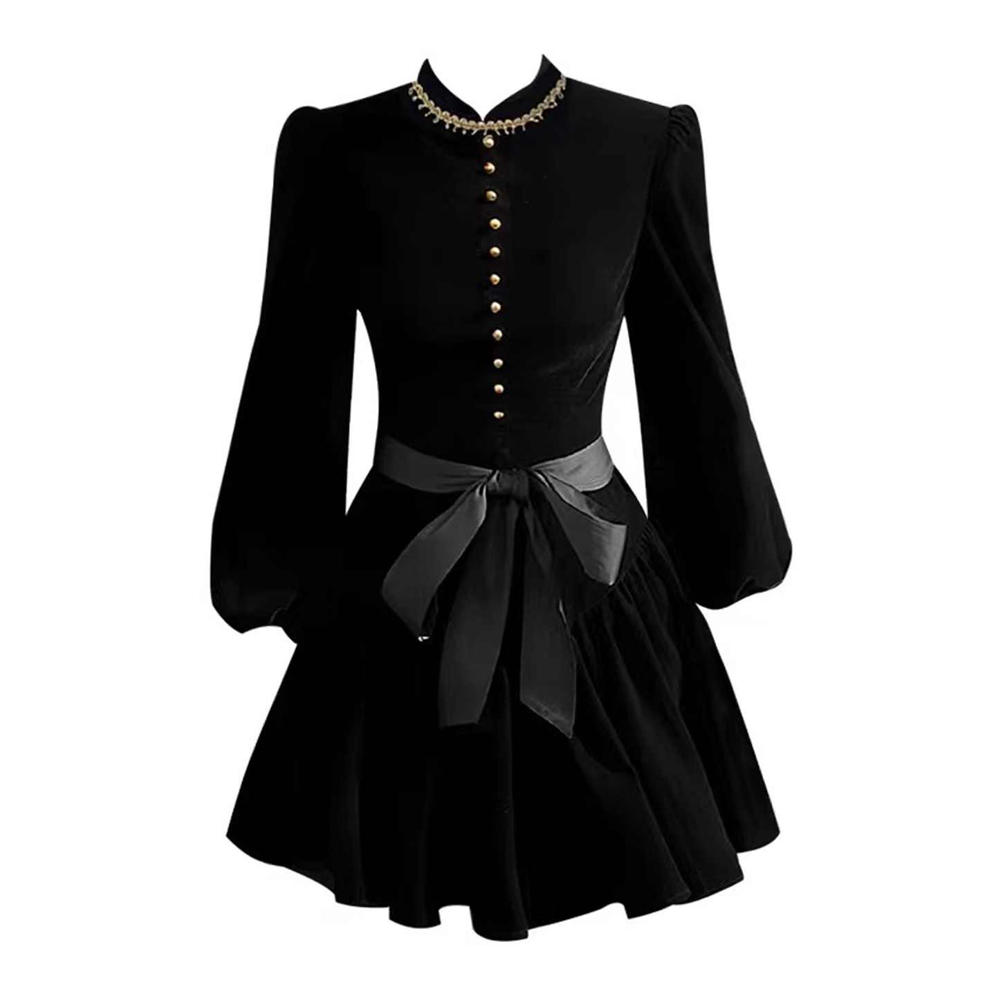 自制伯拉德千金设计感复古赫本风黑色收腰绑带丝绒长袖连衣裙 女