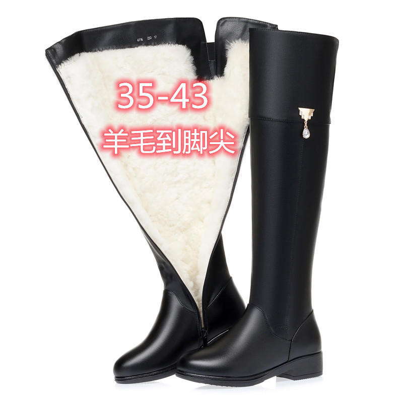 秋冬季真皮过膝靴长靴平跟单靴加厚绒羊毛里高筒防滑大码长筒靴女