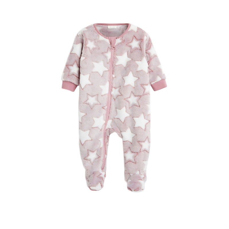 英国NEXT婴儿长袖连身加绒睡衣女宝拉链包脚粉色星星冬款家居哈衣