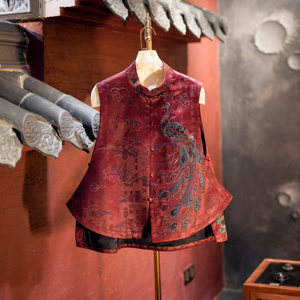 蓝大新中式孔雀刺绣朱红色马甲