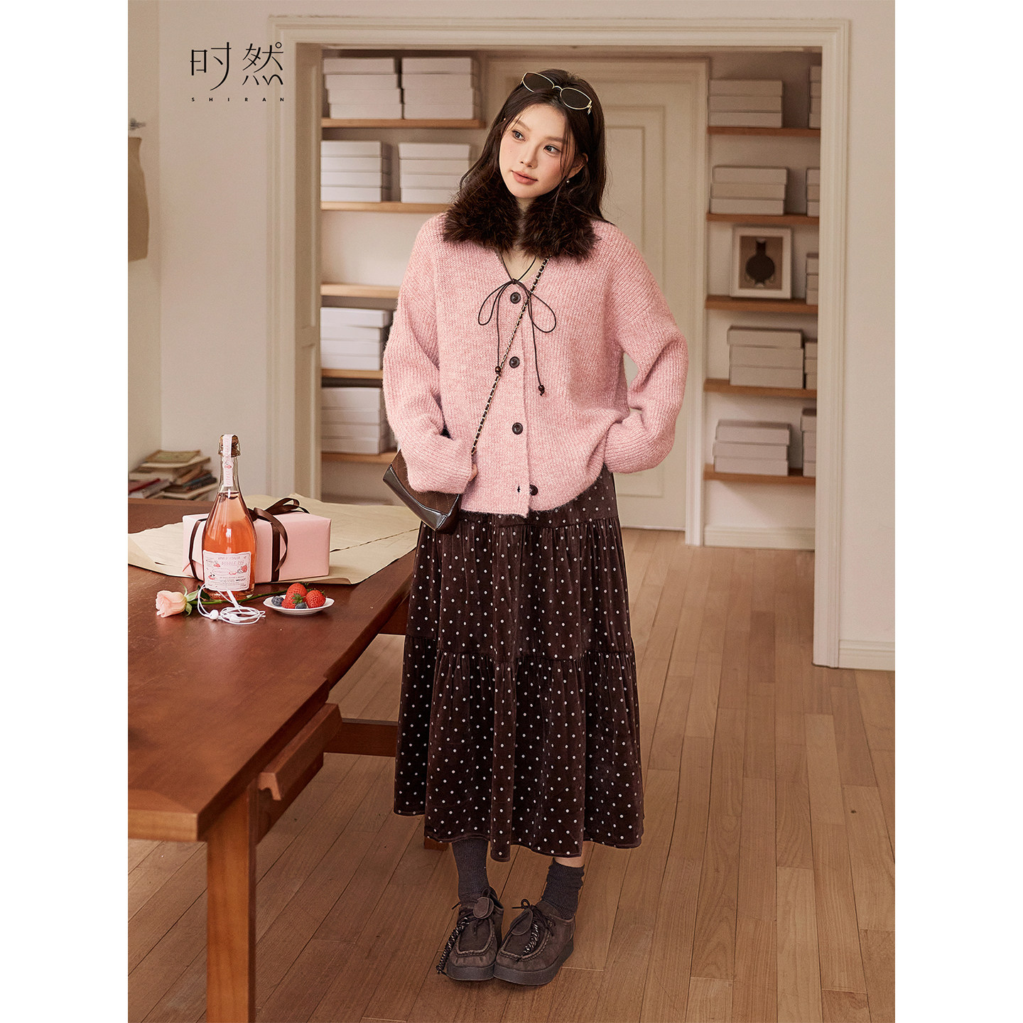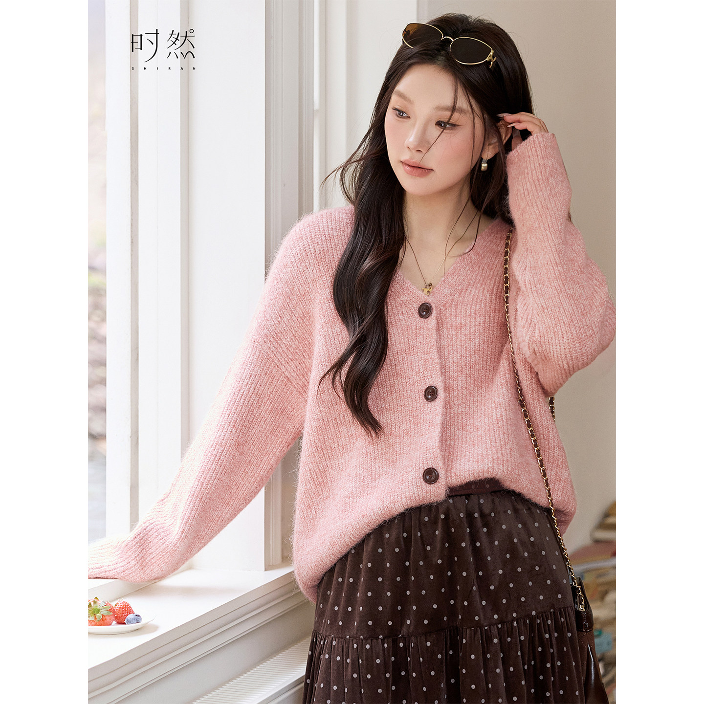 时然大码粉色针织衫春秋微胖女装V领针织开衫毛衣显瘦百搭上衣