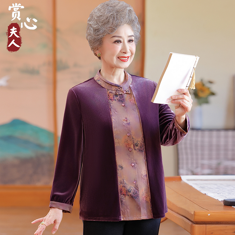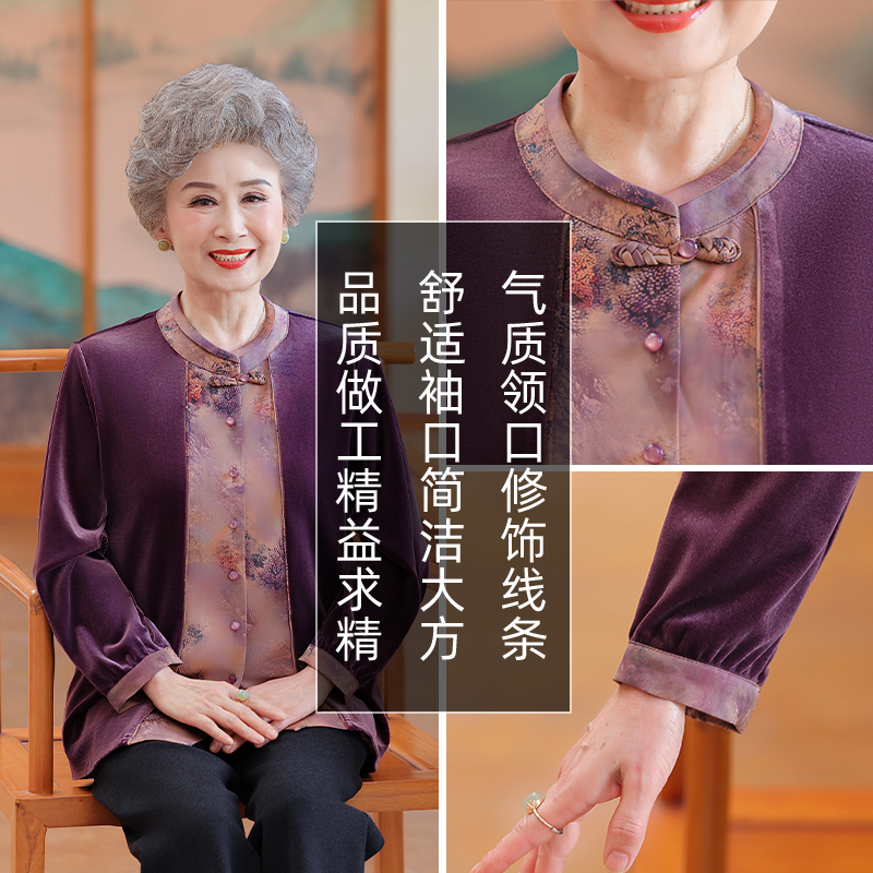 新款奶奶秋装长袖衬衫老年人金丝绒上衣妈妈高贵外套老太太衣服女