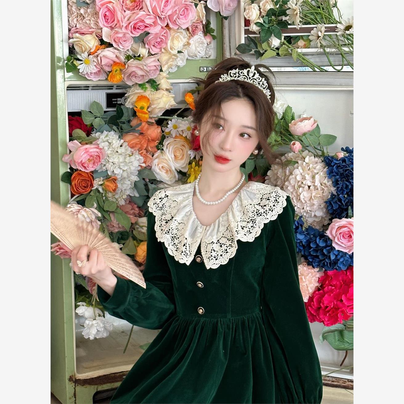高级感气质法式复古蕾丝丝绒连衣裙女秋冬中长款女装别致漂亮暴款