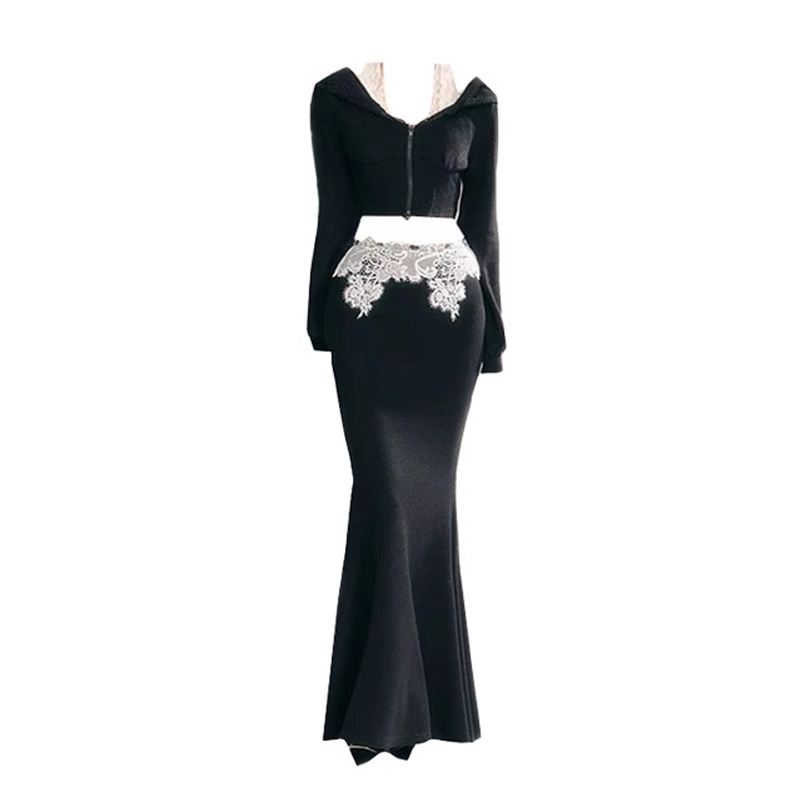 春季新款纯欲风卫衣拼接高腰连帽辣妹上衣+半身裙蕾丝鱼尾两件套