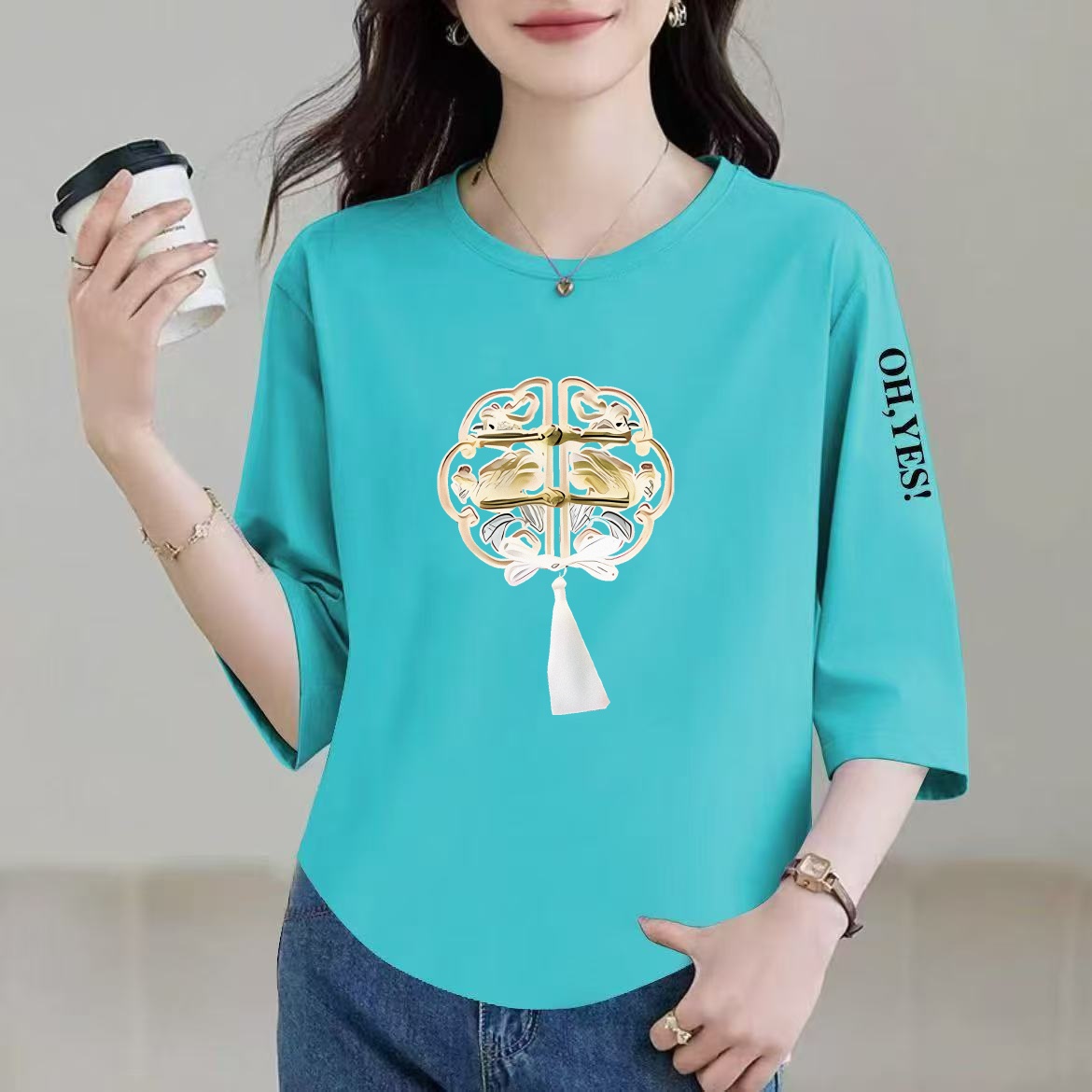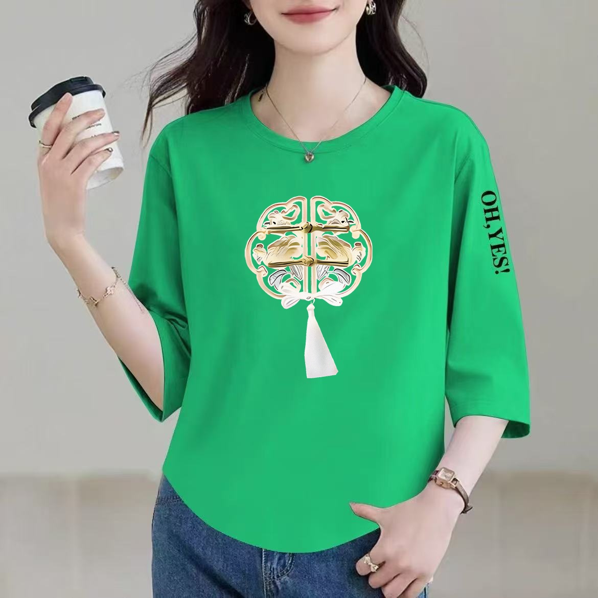 清仓捡漏妈妈装中老年七分袖t恤女新中式遮肉简约印花设计感上衣