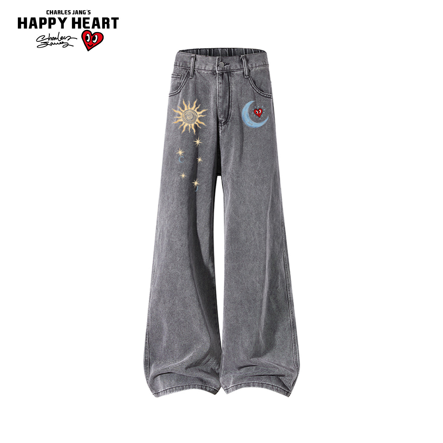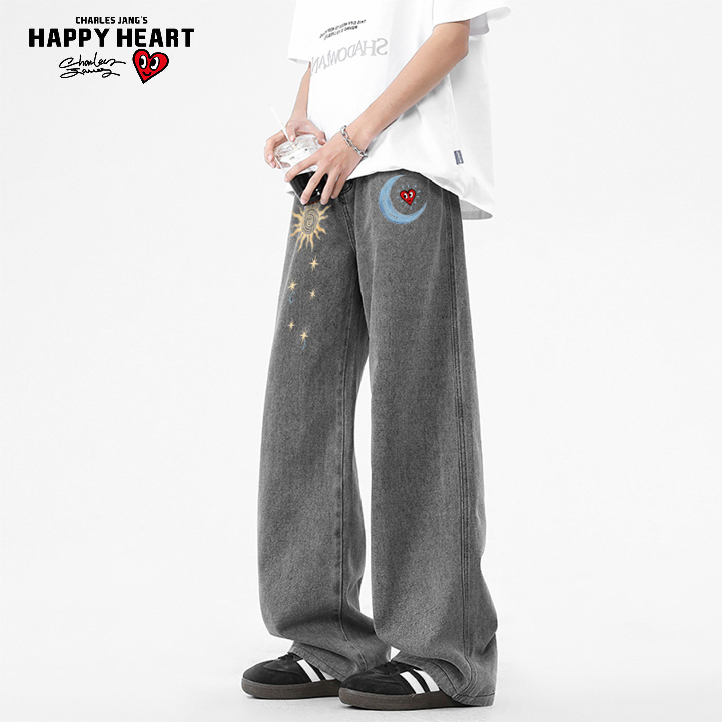 查尔斯桃心美式复古水洗牛仔裤男春秋季百搭宽松直筒休闲工装长裤