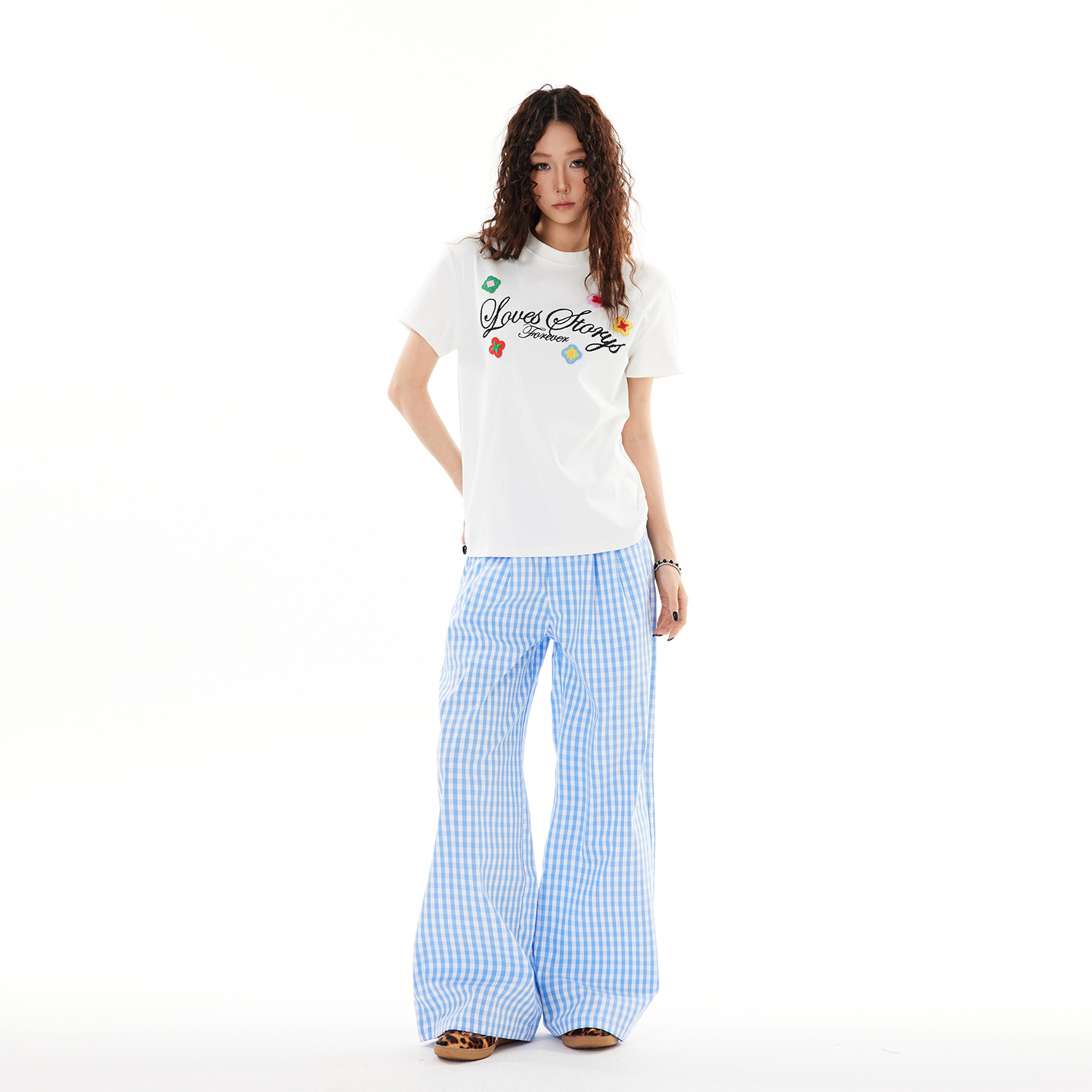 SREK 彩色刺绣小花点缀字母短袖T恤男女夏季美式复古设计感上衣