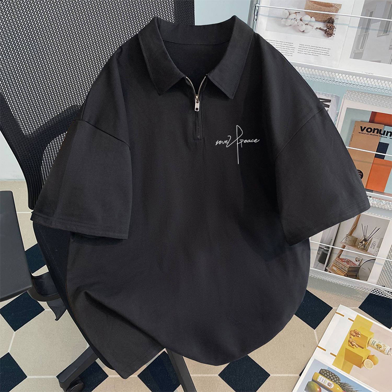 半拉链polo衫男士夏季潮牌宽松青少年休闲翻领五分半袖体恤上衣服