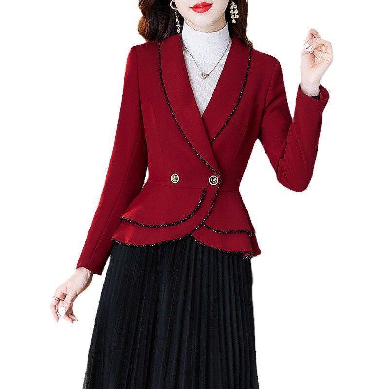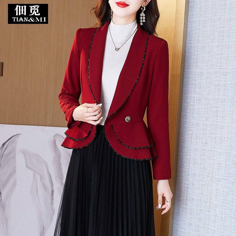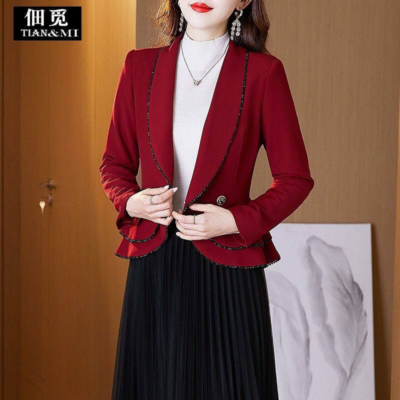 小西装外套女短款2023年新款春秋酒红色设计感上衣小个子西服套装