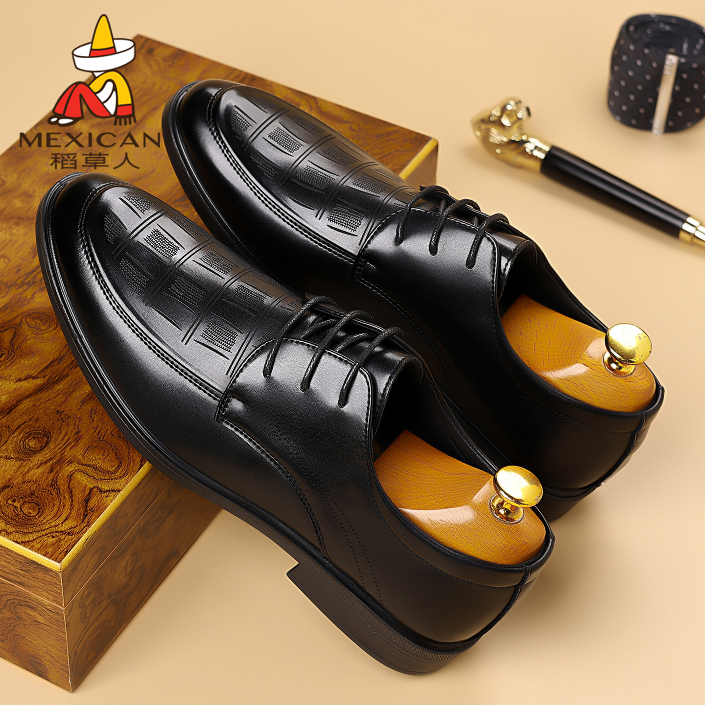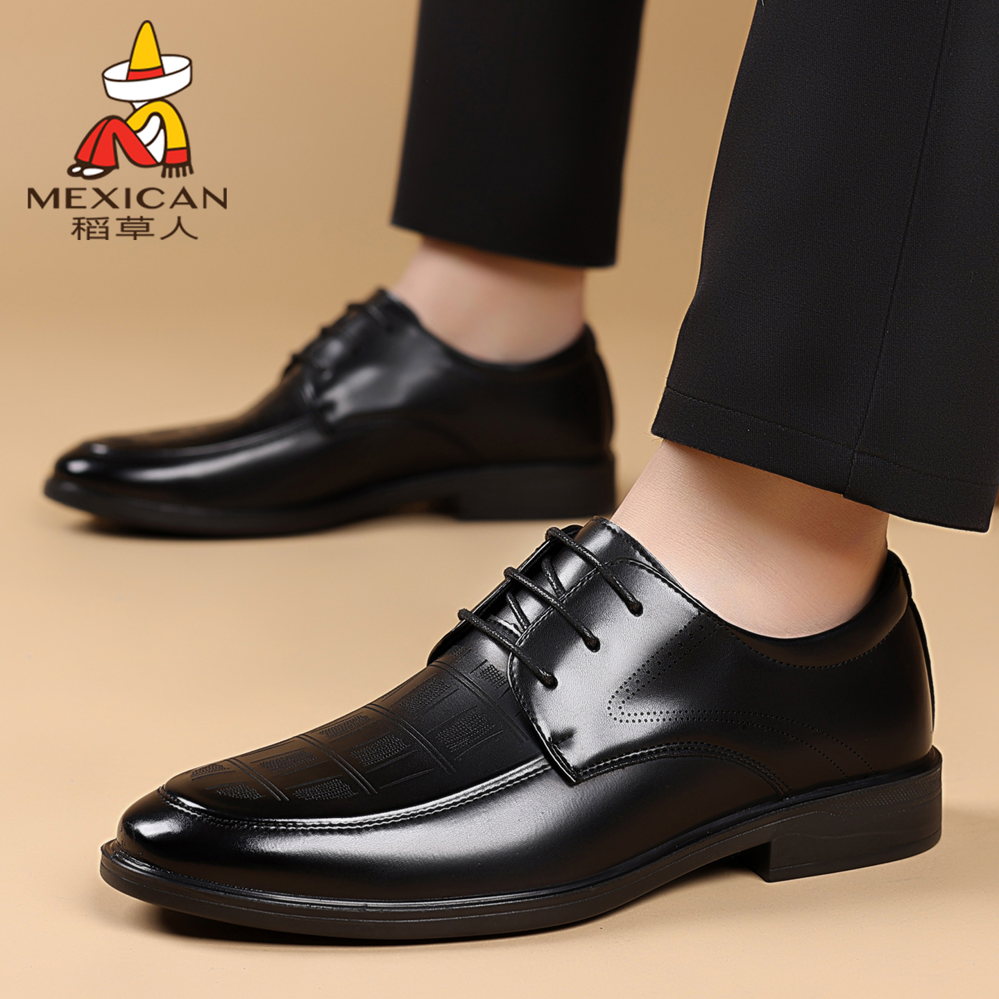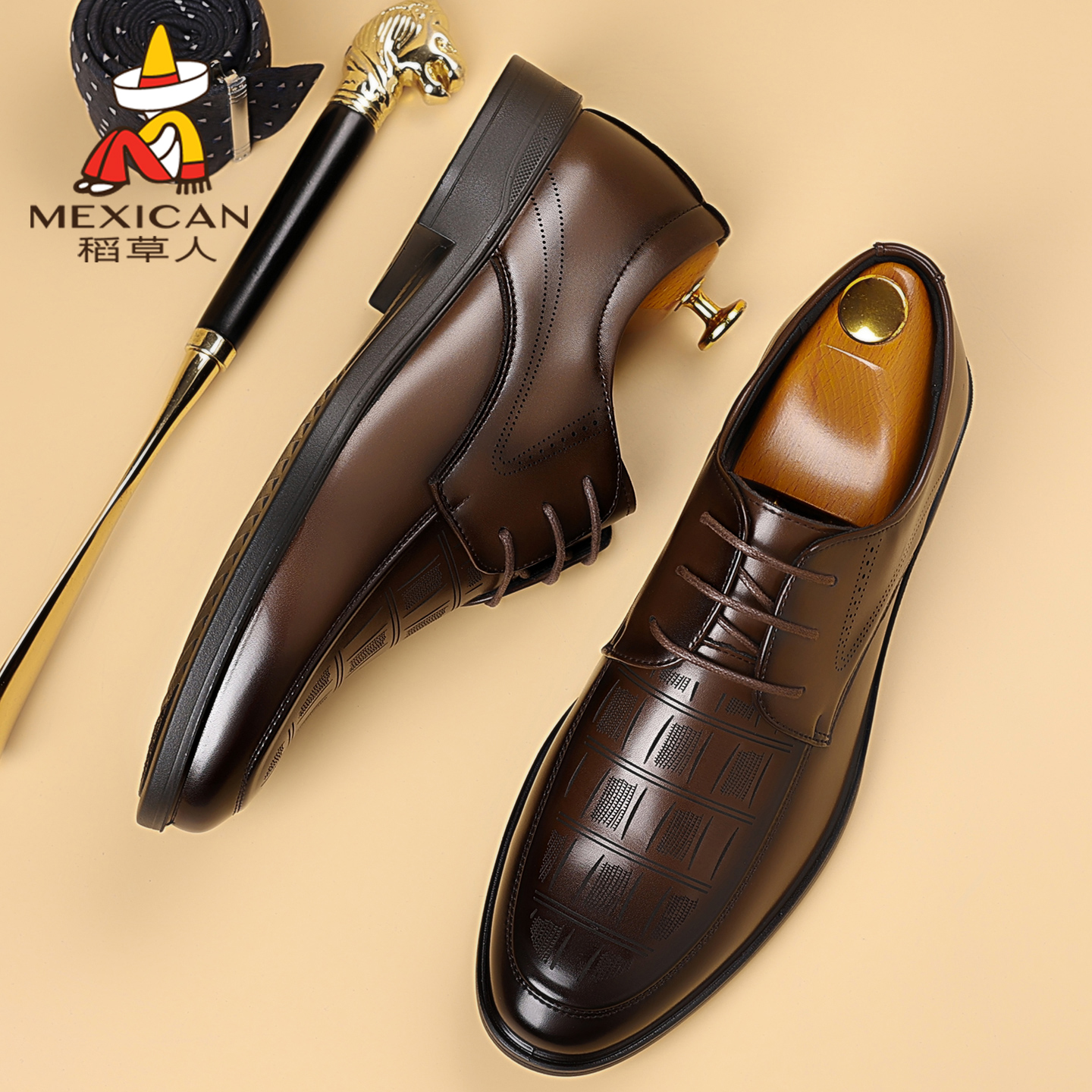 稻草人皮鞋男秋季新款透气真皮正装男鞋商务休闲软底英伦西装婚鞋