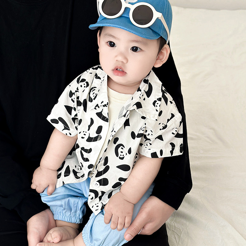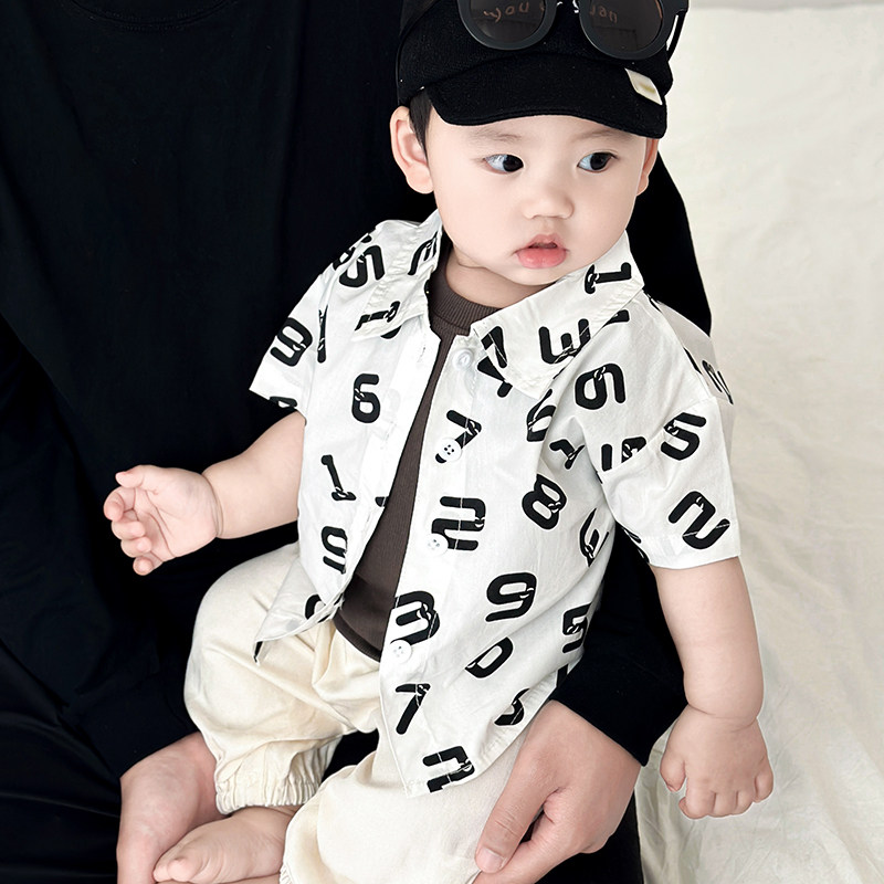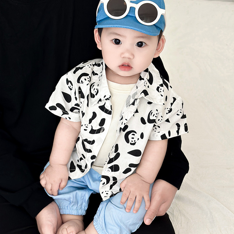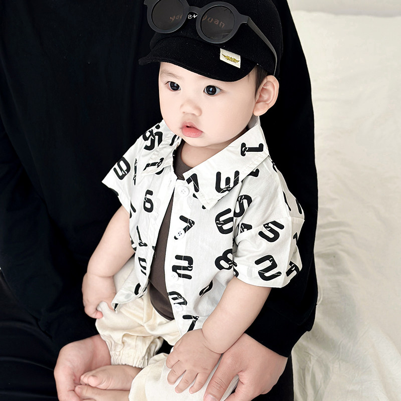 婴儿夏季短袖衬衫套装男童韩版纯色无袖背心女宝宝薄款防蚊长裤潮