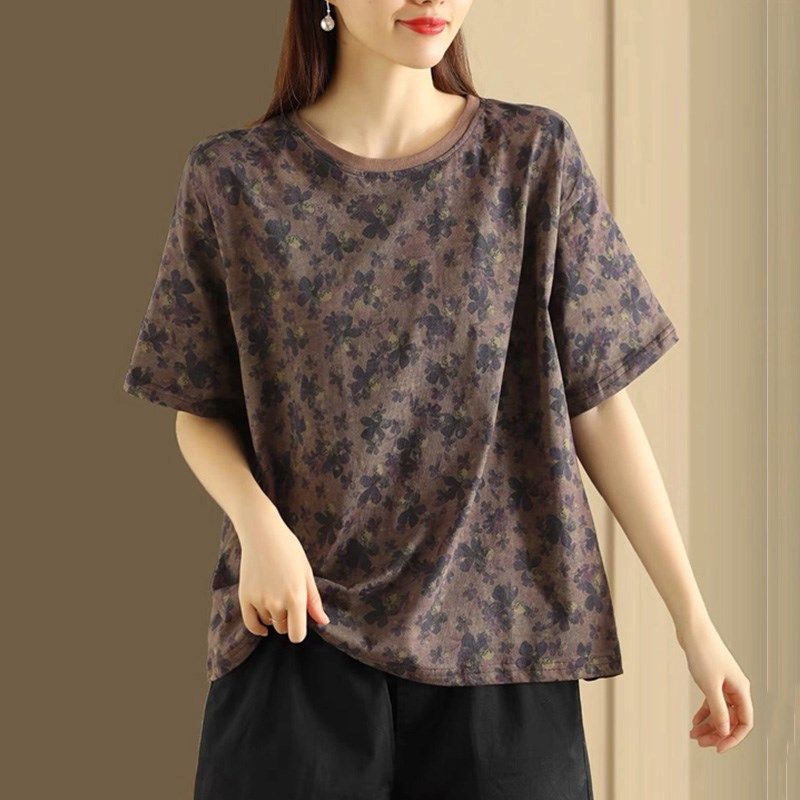 中年妈妈棉麻碎花短袖T恤女士2025夏季新款复古大码宽松苎麻上衣