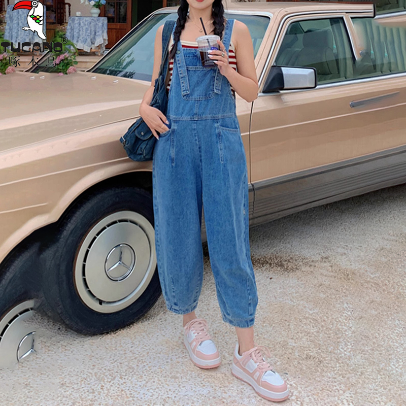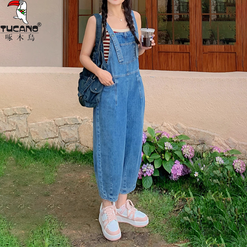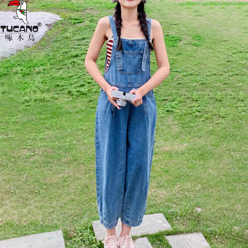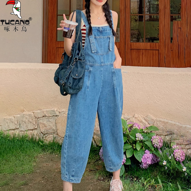 啄木鸟潮流酷盐系奶甜牛仔背带裤女小个子多巴胺网显瘦九分连体裤